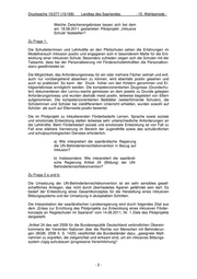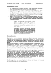 Drucksache 15/277 (15/168) Landtag des Saarlandes - 15. Wahlperiode - Welche Zwischenergebnisse lassen sich bei dem am 18.08.2011 gestarteten Pilotprojekt „Inklusive Schule“ feststellen? Zu Frage 1: Die Schulleiter/innen und Lehrkräfte an den Pilotschulen sehen die Erfahrungen im Modellversuch Inklusion positiv und engagieren sich in besonderem Maße für die Ent- wicklung einer inklusiven Schule. Besonders zufrieden zeigen sich die Schulen mit der Tatsache, dass bei der Personalisierung mit Förderschullehrkräften die Personalkon- stanz gewährleistet ist. Die Möglichkeit, das Anforderungsniveau für ein oder mehrere Fächer zeitnah und evtl. auch nur vorübergehend absenken zu können, wird ebenfalls positiv gesehen und auch so praktiziert. So kann der Druck früher von den Kindern genommen und Er- folgserlebnisse ermöglicht werden. Die kompetenzorientierten Zeugnisse (Grundschu- len) dokumentieren den Lernzu-wachs gemessen an dem jeweils zu Grunde gelegten Anforderungsniveau und wurden deshalb meist positiv, teilweise begeistert von Eltern aufgenommen. Die kompetenzorientierten Beiblätter (weiterführende Schulen), die Schülerinnen und Schüler bei zieldifferentem Unterricht erhielten, wurden sowohl auf Schüler- als auch auf Elternseite positiv bewertet. Die im Pilotprojekt zu inkludierenden Förderbedarfe Lernen, Sprache sowie soziale und emotionale Entwicklung stellen teilweise sehr unterschiedliche Anforderungen an die Lehrkräfte. Beim Förderbedarf soziale und emotionale Entwicklung ist von Fall zu Fall eine stärkere Vernetzung im Bereich der Jugendhilfe sowie des schulärztlichen und schulpsychologischen Dienstes erforderlich. a) Wie interpretiert die saarländische Regierung die UN-Behindertenrechtskonvention in Bezug auf Inklusion? b) Insbesondere: Wie interpretiert die saarländi- sche Regierung Artikel 24 (Bildung) der UN- Behindertenrechtskonvention? Zu Frage 2 a und b: Die Umsetzung der UN-Behindertenrechtskonvention ist ein sehr sensibles gesell- schaftliches Anliegen, das nicht durch überhastetes Agieren gefährdet sein darf. Es bedarf der Entwicklung eines Gesamtkonzeptes für die Herstellung eines inklusiven Bildungssystems und der Umsetzung in akzeptablen Schritten. Die Interpretation der saarländischen Landesregierung wird durch folgendes Zitat aus dem „Erlass zur Errichtung des Pilotprojekts zur Entwicklung eines inklusiven Förder- konzepts an Regelschulen im Saarland“ vom 14.06.2011, Nr. 1 Ziele des Pilotprojekts dargestellt: „Artikel 24 des seit 2009 für die Bundesrepublik Deutschland verbindlichen Überein- kommens der Vereinten Nationen über die Rechte von Menschen mit Behinderun- gen (BGBl. 2008 II, S. 1420) verpflichtet die Bundesländer dazu, „geeignete Maß- nahmen zu ergreifen, die zielgerichtet und wirksam sind, um ein inklusives Bildungs- system zügig aufzubauen (progressive Verwirklichung)“ -2-