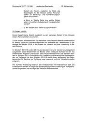 Drucksache 15/277 (15/168) Landtag des Saarlandes - 15. Wahlperiode - Besteht die Absicht, zusätzlich zur Stelle des Beauftragten für die Inklusion weitere Personal- stellen für Beratungs- und Koordinierungsauf- gaben einzurichten? a) Wenn ja: Welche Stelle bzw. welche Stellen sollen mit welchem Aufgabenprofil neu geschaffen werden? b) Wo werden diese Stellen ausgeschrieben? Zu Frage 4 a und b: Derzeit besteht keine Absicht, zusätzlich zu den bisherigen Stellen für die Inklusion weitere Personalstellen einzurichten. Zurzeit beraten Mitarbeiterinnen und Mitarbeiter verschiedener Referate im Ministerium für Bildung und Kultur und Mitarbeiterinnen und Mitarbeiter am Landesinstitut für Pä- dagogik und Medien (LPM) in den Fragen zur Inklusion und ihrer Umsetzung im Be- reich Bildung. Im Schuljahr 2011/12 wurden 25 Inklusionsberaterinnen und -berater berufsbegleitend ausgebildet. Diese Beraterinnen und Berater sollen künftig die Schulen bei den neu entstehenden Aufgaben unterstützen. Den Inklusionsberaterinnen und –beratern stan- den im Schuljahr 2011/12 wöchentlich für Fortbildung und Beratung fünf Deputatsstun- den zur Verfügung. Ab dem Schuljahr 2012/13 stehen ihnen wöchentlich drei Depu- tatsstunden für Beratung zur Verfügung, was insgesamt rund drei Vollzeitlehrerstellen entspricht. Ihre fachliche Anbindung findet an den Förderschulen mit Förderzentrum statt. Die Förderzentren werden in Fragen der sonderpädagogischen Förderung als Kompetenz- zentren angesehen und in Fragen der Inklusion weiterentwickelt. -4-