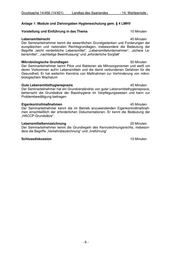Drucksache 14/456 (14/421) Landtag des Saarlandes - 14. Wahlperiode - Anlage 1: Module und Zielvorgaben Hygieneschulung gem. § 4 LMHV Vorstellung und Einführung in das Thema 10 Minuten Lebensmittelrecht 45 Minuten Der Seminarteilnehmer kennt die wesentlichen Grundgedanken und Forderungen der europäischen und nationalen Rechtsgrundlagen, insbesondere die Bedeutung der Begriffe „leicht verderbliche Lebensmittel“, „Lebensmittelunternehmer“, „sichere Le- bensmittel“, „nachteilige Beeinflussung“ und „erforderliche Sorgfalt“ Mikrobiologische Grundlagen 50 Minuten Der Seminarteilnehmer kennt Pilze und Bakterien als Mikroorganismen und weiß um deren Vorkommen auf/in Lebensmitteln und die damit verbundenen Gefahren für die Gesundheit. Er hat weiterhin Kenntnis von Maßnahmen zur Verhinderung von mikro- biologischem Wachstum Gute Lebensmittelhygienepraxis 45 Minuten Der Seminarteilnehmer hat ein Grundverständnis von guter Lebensmittelhygienepraxis, beherrscht die Grundsätze der Basishygiene im Verpflegungswesen und kann zur Problembewältigung beitragen Eigenkontrollmaßnahmen 45 Minuten Der Seminarteilnehmer kennt die im Betrieb anzuwendenden Eigenkontrollmaßnah- men einschließlich der erforderlichen Dokumentationen. Er kennt die Bedeutung der „HACCP-Grundsätze“. Lebensmittelkennzeichnung 20 Minuten Der Seminarteilnehmer kennt die Grundregeln des Kennzeichnungsrechts, insbeson- dere die Begriffe „Verkehrsbezeichnung“ und „Irreführung“ Schlussdiskussion 10 Minuten -6-