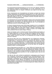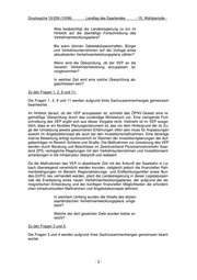 Drucksache 15/209 (15/99) Landtag des Saarlandes - 15. Wahlperiode - Was beabsichtigt die Landesregierung zu tun im Hinblick auf die überfällige Fortschreibung des Verkehrsentwicklungsplans? Bis wann können Gebietskörperschaften, Bürger und Verkehrsunternehmen auf die Vorlage eines aktualisierten Verkehrsentwicklungsplans zählen? Wann wird die Überprüfung, ob der VEP an die neueren Verkehrsentwicklung anzupassen ist, vorgenommen? In welcher Zeit wird eine solche Überprüfung ab- geschlossen sein? Zu den Fragen 1, 2, 9 und 11: Die Fragen 1, 2, 9 und 11 werden aufgrund ihres Sachzusammenhanges gemeinsam beantwortet. Im Hinblick darauf, ob der VEP anzupassen ist, schreibt das ÖPNV-Gesetz eine re- gelmäßige Überprüfung durch das zuständige Ministerium vor. Eine zwingende Fort- schreibung des VEP ergibt sich aus dieser Vorgabe nicht. Vielmehr ist im VEP ausge- führt, dass er ein flexibles Planungsinstrument ist, das vor dem Hintergrund der im Zu- ge der Umsetzung jeweils gewonnenen Erfahrungen offen sein muss für Anpassungen sowohl im Angebotskonzept als auch bei den Investitionsmaßnahmen. Eine derartige interne Bewertung erfolgt kontinuierlich im Rahmen der Investitionsplanungen der Auf- gabenträger im Bereich Schiene und Straße. Die Maßnahmen zur Umsetzung des VEP werden durch Beratung und Beschlüsse im Zweckverband Personennahverkehr Saar- land ZPS, vertragliche Regelungen mit den Verkehrsunternehmen und Investitionsent- scheidungen in die Infrastruktur überprüft und realisiert. Da die Maßnahmen des VEP in absehbarer Zeit mit der Ankunft der Saarbahn in Le- bach überwiegend verwirklicht werden konnten, zeitgleich jedoch die finanziellen Rah- menbedingungen im Bereich Regionalisierungs- und Entflechtungsmittel sowie Bun- des-GVFG neu verhandelt werden, plant die Landesregierung in dieser Legislaturperi- ode die Erarbeitung eines neuen Verkehrsentwicklungsplanes, der aufgrund der de- mografischen Entwicklung und der künftigen finanziellen Möglichkeiten die erforderli- chen infrastrukturellen Maßnahmen und Angebotskonzepte definiert. In welchem Umfang wurden die Inhalte des letzten saarländischen Verkehrsentwicklungsplans umge- setzt? Welche der dort gesetzten Ziele wurden bisher er- reicht? Zu den Fragen 3 und 4: Die Fragen 3 und 4 werden aufgrund ihres Sachzusammenhanges gemeinsam beant- wortet. -3-
