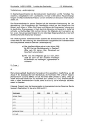 Drucksache 15/351 (15/239) Landtag des Saarlandes - 15. Wahlperiode - a) Welche Maßnahmen wurden seitens der Lan- deregierung und der jeweiligen Feuerwehren getroffen, um verstärkt auch Frauen und junge Menschen bei der Berufsfeuerwehr und den Freiwilligen Feuerwehren zu gewinnen? b) Gibt es einen Frauen-/ Jugendförderungsplan der Landesregierung? Wenn ja, welche Maß- nahmen sehen diese Pläne vor? c) Welche Möglichkeiten sieht die Landesregie- rung, um zukünftig mehr Frauen und generell neue Bewerber für den Dienst bei der Berufs- feuerwehr bzw. Nachwuchs der Freiwilligen Feuerwehr zu gewinnen? (Bitte jeweils nach Maßnahme sowie zwischen Berufsfeuerwehr und Freiwilliger Feuerwehr untergliedern) d) Wurde etwa auch überlegt, die Bewerbungs- homepage der Berufsfeuerwehr entsprechend attraktiv zu gestalten und/oder durch spezielle Werbekampagnen verstärkt offene Stellen bei der Berufsfeuerwehr sowie generell die Mit- gliedschaft bei einer Freiwilligen Feuerwehr zu bewerben? Falls nein, warum nicht? e) Werben die verantwortlichen Stellen verstärkt auch im Nachwuchsbereich um Frauen, bei- spielsweise durch sogenannte „Girls Days“ so- wohl für die Berufsfeuerwehr als auch für Frei- willige Feuerwehren oder durch sonstige Infor- mationsveranstaltungen? Wenn nein, warum nicht? f) Wie und in welcher Höhe wird die Nachwuchs- arbeit der Freiwilligen Feuerwehren zurzeit durch die Landesregierung unterstützt und ge- fördert? g) Soll die jährliche Förderung der Jugendarbeit des Landesfeuerwehrverbandes erhöht werden und wenn ja, in welcher Höhe? -9-