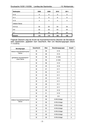 Drucksache 15/351 (15/239) Landtag des Saarlandes - 15. Wahlperiode - Vorbemerkung Landesregierung: Im Saarland gewährleisten die Berufsfeuerwehr Saarbrücken und 52 Freiwillige Feu- erwehren, untergliedert in 341 Löschbezirke, mit fast 12.000 aktiven Feuerwehrange- hörigen eine flächendeckende Präsenz und ein Eintreffen am Einsatzort innerhalb kür- zester Zeit. Den Feuerwehrleuten im ganzen Saarland gilt die besondere Anerkennung der Lan- desregierung. Das Engagement der Feuerwehren erlaubt es den Bürgerinnen und Bürgern sich sicher zu fühlen. Die Frauen und Männer der Feuerwehren nehmen gro- ße persönliche Anstrengungen in Kauf, damit die Menschen im Saarland im Notfall mit schneller und fachkundiger Hilfe rechnen können. Die Mitglieder der Feuerwehren ge- ben so ein herausragendes Beispiel für eine lebendige Bürgergesellschaft, in der sich die Menschen aktiv füreinander einsetzen. Die Erhaltung dieses flächendeckenden Systems des Brandschutzes und der Techni- schen Hilfe und die Förderung des ehrenamtlichen Engagements im Feuerwehrwesen sind übergreifende politische Ziele der Landesregierung. a) Wie viele Beschäftigte gab es in den Jahren 2008 bis 2011 bei der Berufsfeuerwehr im Saarland? (Bitte nach Ort, Jahren, Alter, Dienstgrad und Geschlecht unterscheiden) b) Wie viele aktive Mitglieder gab es in den Jahren 2008 bis 2011 bei den einzelnen Freiwilligen Feuerwehren und Freiwilligen Jugendwehren im Saarland? Zu Frage 1: a) Die Landeshauptstadt Saarbrücken hat aufgrund ihrer gesetzlichen Verpflichtung aus § 3 Absatz 1 des Gesetzes über den Brandschutz, die Technische Hilfe und den Katastro- phenschutz im Saarland (SBKG) vom 29. November 2006 (Amtsbl. S. 2207), zuletzt ge- ändert durch das Gesetz vom 16. November 2011 (Amtsbl. I S. 431), eine Berufsfeuer- wehr zu bilden (Einwohnerzahl 176.098; Stand 30.06.2012). Es ist die einzige Berufsfeu- erwehr im Saarland. Folgende Übersicht zeigt die Beamtenstellen im feuerwehrtechnischen Dienst der Berufs- feuerwehr Saarbrücken für die Jahre 2008 bis 2011: Stellenplan 2008 2009 2010 2011 höherer Dienst A 16 1 1 1 1 A 15 2 1 1 1 A 14 A 13 1 1 1 1 gehobener Dienst A 13 g.D. 2 1 2 2 -2-