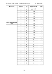 Drucksache 15/351 (15/239) Landtag des Saarlandes - 15. Wahlperiode - Berufsgruppe Geschlecht Alter Besoldungsgruppe Anzahl M 47 A 9/S+Zulage 2 M 43 A 9/S+Zulage 1 M 59 A 9/S 1 M 58 A 9/S 1 M 57 A 9/S 1 M 56 A 9/S 1 M 53 A 9/S 2 M 52 A 9/S 1 M 50 A 9/S 2 mittlerer feuerwehrtechnischer Dienst M 49 A 9/S 3 M 48 A 9/S 1 M 47 A 9/S 3 M 46 A 9/S 3 M 45 A 9/S 3 M 44 A 9/S 4 M 43 A 9/S 4 M 42 A 9/S 2 M 41 A 9/S 3 M 51 A8 2 M 50 A8 1 M 49 A8 1 M 48 A8 1 M 47 A8 2 M 45 A8 3 M 44 A8 6 M 43 A8 2 M 42 A8 6 M 41 A8 4 M 40 A8 7 M 39 A8 2 M 38 A8 5 M 37 A8 7 M 36 A8 2 -4-