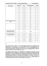 Drucksache 15/351 (15/239) Landtag des Saarlandes - 15. Wahlperiode - Berufsgruppe Geschlecht Alter Besoldungsgruppe Anzahl M 35 A8 2 M 32 A8 2 M 40 A7 2 M 37 A7 1 W 36 A7 1 M 36 A7 3 M 35 A7 4 M 34 A7 3 M 33 A7 3 mittlerer feuerwehrtechnischer M 32 A7 7 Dienst M 31 A7 8 M 30 A7 3 M 29 A7 4 M 28 A7 4 M 27 A7 2 Anwärter gehobener feuer- M 26 Aw A 9 1 wehrtechnischer Dienst M 29 Aw A 7 1 Anwärter mittlerer feuerwehr- technischer Dienst M 27 Aw A 7 3 M 25 Aw A 7 3 M 24 Aw A 7 2 M 23 Aw A 7 2 M 22 Aw A 7 1 b) Das Saarland hatte im Jahr 2011 11.672 Angehörige im Bereich der Freiwilligen Feuer- wehren. Dies ist im Vergleich zu den Jahren 2008 bis 2011 die niedrigste Zahl. Den Höchststand im erfragten Zeitraum wurde 2010 mit 11.761 Feuerwehrangehörigen er- reicht. Dies bedeutet einen Rückgang von 0,76 Prozent der Mitgliederzahlen in den Frei- willigen Feuerwehren in den Jahren 2010 auf 2011. Im Folgenden sind die Zahlen von Angehörigen der Freiwilligen Feuerwehren und der Jugendfeuerwehren des Saarlandes, unterteilt in die Landkreise und den Regionalverband Saarbrücken, für die Jahre 2008 bis 2011 aufgeführt. Die aufgeführten Daten beruhen auf der Erhebung „Feuerwehren im Saarland; Jahresstatistik 2011“ (Stand: 31.12.2011). Wei- terführende Daten werden von der jährlich vom Ministerium für Inneres und Sport zu erstellenden Statistik nicht erfasst und liegen daher auch nicht vor. Aufgabenträger des Feuerwehrwesens sind nach § 2 Absatz 1 SBKG die Kommunen. -5-