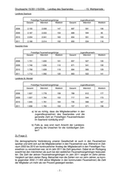 Drucksache 15/351 (15/239) Landtag des Saarlandes - 15. Wahlperiode - Landkreis Saarlouis: Freiwillige Feuerwehrangehörige Jugendfeuerwehr Gesamt Männlich Weiblich Gesamt Männlich Weiblich 2008 2.155 2.008 147 697 591 106 2009 2.187 2.033 154 689 594 95 2010 2.204 2.041 163 654 551 103 2011 2.166 2.014 152 650 534 116 Saarpfalz-Kreis: Freiwillige Feuerwehrangehörige Jugendfeuerwehr Gesamt Männlich Weiblich Gesamt Männlich Weiblich 2008 1.731 1.630 101 657 527 130 2009 1.746 1.636 110 671 541 130 2010 1.758 1.639 119 684 565 129 2011 1.712 1.592 120 663 522 141 Landkreis St. Wendel: Freiwillige Feuerwehrangehörige Jugendfeuerwehr Gesamt Männlich Weiblich Gesamt Männlich Weiblich 2008 1.937 1.778 159 789 612 177 2009 1.937 1.784 153 717 544 173 2010 1.945 1.781 164 735 568 167 2011 1.936 1.783 153 727 571 156 a) Ist es richtig, dass die Mitgliederzahlen in den Jugendfeuerwehren des Saarlandes und die generelle Zahl an Freiwilligen Feuerwehrleuten im Saarland rückläufig sind? b) Falls ja, was sind nach Ansicht der Landesre- gierung die Ursachen für die rückläufigen Zah- len? Zu Frage 2: Die demographische Veränderung unserer Gesellschaft ist auch in den Feuerwehren spürbar und wirkt sich auf die Mitgliederzahlen in den Feuerwehren aus. Während im Zeit- raum 2002 bis 2010 ein kontinuierlicher Anstieg der Mitgliederzahl in den Freiwilligen Feu- erwehren zu verzeichnen war, ist im Jahr 2011 die Zahl gesunken. Dabei ist ein Rückgang sowohl bei den männlichen als auch bei den weiblichen Feuerwehrangehörigen festzustel- len. Die Zahl der aktiven Feuerwehrangehörigen im Jahr 2011 rangiert im Zehn-Jahres- Vergleich auf dem vierten Rang. Betrachtet man die Zahlen von vor zehn Jahren, so konn- te gegenüber 2002 (11.403 aktive Mitglieder in den kommunalen Feuerwehren) die Zahl der Mitglieder um mehr als vier Prozent gesteigert werden. -7-