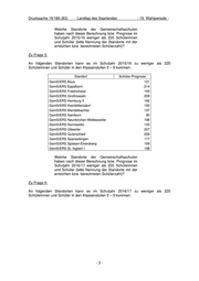 Drucksache 15/180 (83) Landtag des Saarlandes - 15. Wahlperiode - Welche Standorte der Gemeinschaftsschulen haben nach dieser Berechnung bzw. Prognose im Schuljahr 2015/16 weniger als 220 Schülerinnen und Schüler (bitte Nennung der Standorte mit der erreichten bzw. berechneten Schülerzahl)? Zu Frage 3: An folgenden Standorten kann es im Schuljahr 2015/16 zu weniger als 220 Schülerinnen und Schüler in den Klassenstufen 5 – 9 kommen: Standort Schüler-Prognose GemS/ERS Bous 121 GemS/ERS Eppelborn 214 GemS/ERS Friedrichstal 150 GemS/ERS Großrosseln 209 GemS/ERS Homburg II 192 GemS/ERS Kleinblittersdorf 150 GemS/ERS Mandelbachtal 137 GemS/ERS Namborn 90 GemS/ERS Neunkirchen-Wellesweiler 198 GemS/ERS Nonnweiler 133 GemS/ERS Ottweiler 207 GemS/ERS Quierschied 206 GemS/ERS Saarwellingen 177 GemS/ERS Spiesen-Elversberg 199 GemS/ERS St. Ingbert I 198 Welche Standorte der Gemeinschaftsschulen haben nach dieser Berechnung bzw. Prognose im Schuljahr 2016/17 weniger als 220 Schülerinnen und Schüler (bitte Nennung der Standorte mit der erreichten bzw. berechneten Schülerzahl)? Zu Frage 4: An folgenden Standorten kann es im Schuljahr 2016/17 zu weniger als 220 Schülerinnen und Schüler in den Klassenstufen 5 – 9 kommen: -3-