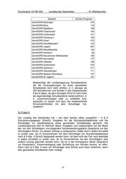 Drucksache 15/180 (83) Landtag des Saarlandes - 15. Wahlperiode - Zudem wurde das Schulordnungsgesetz dahingehend geändert, dass nunmehr über die Errichtung, Änderung und Auflösung öffentlicher Schulen im Rahmen der Schulentwicklungsplanung der Schulträger entschieden wird. Die Erstellung der Schulentwicklungspläne obliegt ausdrücklich den Schulträgern; diese sind gehalten, Vorschläge zu unterbreiten, wie die neuen Vorgaben umzusetzen sind. Unabhängig davon kann nunmehr insbesondere keine Schule von der Schulaufsichtsbehörde gegen den Willen der Schulträger mit einer anderen zusammengelegt oder geschlossen werden. Welches sind die aktuellen Anmeldezahlen an den einzelnen Grundschulen (1. Schuljahr), den Ge- meinschaftsschulen und Gymnasien (5. Schuljahr) für das Schuljahr 2012/13, die zugleich die Grund- lage für die Personalisierungsplanungen sind? Bitte Standortübersicht beifügen! Zu Frage 1: Die Anzahl der Schülerinnen und Schüler in den Eingangsklassen können den Anlagen 1 und 2 entnommen werden. Diese Angaben stammen aus der Schnellmeldung des 1. Schultages und können sich folglich noch leicht ändern. Welche Standorte der Gemeinschaftsschulen haben nach Einrechnung der aktuellen Anmeld- ungen zum 5. Schuljahr und unter Berücksichti- gung der bestehenden Schülerzahlen bzw. Schü- lerzahlprognosen der auslaufenden Erweiterten Realschulen und Gesamtschulen der Klassen 6 bis 9 im Schuljahr 2014/15 weniger als 220 Schülerinnen und Schüler (bitte Nennung der Standorte mit der erreichten bzw. berechneten Schülerzahl)? Zu Frage 2: An folgenden Standorten kann es im Schuljahr 2014/15 zu weniger als 220 Schülerinnen und Schüler in den Klassenstufen 5 – 9 kommen: Standort Schüler-Prognose GemS/ERS Bous 145 GemS/ERS Friedrichstal 165 GemS/ERS Homburg II 212 GemS/ERS Kleinblittersdorf 198 GemS/ERS Mandelbachtal 138 GemS/ERS Namborn 110 GemS/ERS Neunkirchen-Wellesweiler 213 GemS/ERS Nonnweiler 127 GemS/ERS Quierschied 213 GemS/ERS Saarlouis I 212 GemS/ERS Saarwellingen 190 GemS/ERS Spiesen-Elversberg 196 GemS/ERS St. Ingbert I 216 -2-