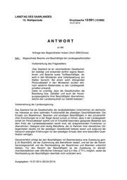 LANDTAG DES SAARLANDES 15. Wahlperiode Drucksache 15/991 (15/889) 10.07.2014 ANTWORT zu der Anfrage des Abgeordneten Hubert Ulrich (B90/Grüne) betr.: Abgeordnete Beamte und Beschäftigte bei Landesgesellschaften Vorbemerkung des Fragestellers: „Das Saarland ist an verschiedenen Gesellschaf- ten beteiligt und entsendet dorthin eigene Beam- tinnen und Beamte sowie Tarifbeschäftigte, ob- wohl in den Ministerien eine Unterbesetzung von Stellen herrscht. Bei einem solch drängenden Personalbedarf in den Ministerien wurden den- noch weiterhin Bedienstete zu den Landesgesell- schaften entsandt. Dabei ist unstrittig, dass die Gesellschaften die Besoldung bzw. Gehälter und auch die Versor- gungsausgleiche ihrer Beschäftigten übernehmen, welche den Landeshaushalt nur indirekt belasten.“ Vorbemerkung der Landesregierung: Das Saarland hat als Gesellschafter der landesbeteiligten Unternehmen ein elementa- res Interesse an einer optimalen Funktionalität der jeweiligen Geschäftsbetriebe. Der Einsatz von Beamtinnen, Beamten und sonstigen Beschäftigten in den privatrechtli- chen Einrichtungen ist in der Regel darauf zurück zu führen, dass in der Landesgesell- schaft ein Personalbedarf auftritt und im Einzelfall besonders geeignete Bewerber aus dem Kreis der Landesbediensteten bereit sind, die entsprechenden Funktionen zu übernehmen. Geeignet sind häufig Betroffene, die im Rahmen ihrer dienstlichen Ob- liegenheiten bereits mit der jeweiligen Gesellschaft befasst waren und aufgrund der hierdurch erlangten Erfahrungen für den jeweiligen Einsatz über eine besondere Quali- fikation verfügen. Dienstrechtlich erfolgt bei den Beschäftigten mit Beamtenstatus eine Zuweisung gem. § 20 BeamtStG, die der Zustimmung des Betroffenen bedarf, und bei der die Dienst- herreneigenschaft und die Rechtsstellung der Beamtinnen und Beamten unberührt bleiben. Für den Bereich der Beschäftigten ist die Zuweisung im dienstli- chen/betrieblichen oder öffentlichen Interesse nach § 4 Abs. 2 TV-L möglich, wobei die Rechtsstellung der Beschäftigten ebenfalls nicht verändert wird. Ausgegeben: 10.07.2014 (29.04.2014)