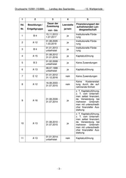 Drucksache 15/991 (15/889) ___Landtag des Saarlandes - 15. Wahlperiode - 1 2 3 4 5 Dauer der Finanzierungsart der lfd. Besoldungs-/ Leerstelle Zuweisung aufnehmenden Lan- Nr. Entgeltgruppe ja/nein desgesellschaft von - bis 15.11.2013 - Institutionelle Förde- 1 B4 ja 1.07.2017 rung 01.08.2005 - Institutionelle Förde- 2 A 12 ja 1.03.2019 rung 01.01.2013 - Institutionelle Förde- 3 B4 ja unbefristet rung 01.08.2012 - 4 A 15 ja Kapitalzuführung 31.01.2016 01.02.2009 - 5 B3 ja Keine Zuwendungen unbefristet 09.07.1999 - 6 A 13 ja Kapitalzuführung unbefristet 01.01.2012 - 7 E 12 nein Keine Zuwendungen 31.12.2016 Keine Kostenerstat- 16.08.2003 - 8 A 12 nein tung durch die auf- 31.07.2015 nehmende Einheit z. T. Kapitalzuführung, z. T. vom Unterneh- men selbst finanziert, 01.08.2009 - da Verwendung bei 9 A 16 ja 31.07.2014 mehreren Unterneh- men mit unterschiedli- cher finanzieller Aus- stattung z. T. Kapitalzuführung, z. T. vom Unterneh- men selbst finanziert, 01.08.2010 - da Verwendung bei 10 A 13 ja 31.07.2015 mehreren Unterneh- men mit unterschiedli- cher finanzieller Aus- stattung 01.01.2014- 11 A 13 nein Kapitalzuführung unbefristet -3-