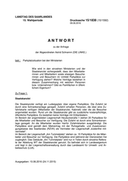 LANDTAG DES SAARLANDES 15. Wahlperiode Drucksache 15/1838 (15/1592) 09.06.2016 ANTWORT zu der Anfrage der Abgeordneten Astrid Schramm (DIE LINKE.) betr.: Parkplatzsituation bei den Ministerien Wie wird in den einzelnen Ministerien und der Staatskanzlei sichergestellt, dass den Mitarbeite- rinnen und Mitarbeitern sowie etwaigen Besuche- rinnen und Besuchern im Umfeld Parkplätze zur Verfügung stehen? Welche Verträge bestehen in diesem Zusammenhang mit welchen Personen bzw. Unternehmen? Gibt es Parkflächen in öffent- lichem Eigentum? Zu Frage 1: Staatskanzlei Die Staatskanzlei verfügt am Ludwigsplatz über eigene Parkplätze. Die Zufahrt ist durch eine Schrankenanlage geregelt. Zufahrt erhalten Personen, die über eine Zu- fahrtskarte verfügen (Mitarbeiter der Staatskanzlei, Kabinett) oder die als Besucher angemeldet wurden. Rund um die Staatskanzlei gibt es zusätzliche kostenpflichtige, öffentliche Parkplätze. Es bestehen keine Verträge mit Drittanbietern. Im Bereich der angemieteten Liegenschaft Heuduckstraße 1 stehen 20 Parkplätze für die Mitarbeiter und Besucher zur Verfügung. Die Zufahrt ist durch eine Schrankenan- lage geregelt. An die Mitarbeiter wurden hierfür Zufahrtskarten ausgehändigt. Die Parkplätze sind gemäß dem Mietvertrag mit der Ruhegehalts- und Zusatzversor- gungskasse des Saarlandes (RZVK) als Vermieter der Liegenschaft „kostenfrei mit- vermietet“. Im Bereich der Liegenschaft „Am Tummelplatz“ stehen ca. 15 Parkplätze für die Mitar- beiter und Besucher zur Verfügung. Die Parkplätze sind während der Dienstzeiten frei zugänglich. Das Gebäude „Am Tummelplatz“ wird nur in Teilen durch einzelne Refera- te der Abteilung WT der Staatskanzlei genutzt. Es befindet sich in Landeseigentum und liegt in der Liegenschaftsverwaltung durch das Landesamt für Umwelt- und Ar- beitsschutz (LUA). Ausgegeben: 10.06.2016 (24.11.2015)