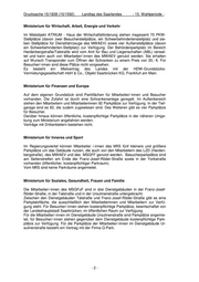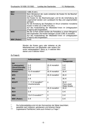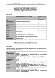 Drucksache 15/1838 (15/1592) Landtag des Saarlandes - 15. Wahlperiode - Werden diese Parkmöglichkeiten (eventuell zu bestimmten Zeiten oder Anlässen) auch der Öf- fentlichkeit zur Verfügung gestellt oder sind diese ausschließlich für den unter 1. genannten Perso- nenkreis reserviert? Zu Frage 4: Öffentlich zur Verfügung gestellt Nutzung nur Mitarbeiter und Besucher StK (Ludwigsplatz) Samstags und anlassbezogen (Heuduckstraße) X (Tummelplatz) X MFE X MWAEV X MIS MSGFF Wochenende MdJ MUV 47 am Wochenende und an Feiertagen MBK An Wochenenden Vermietung durch Vermieter MBK (Reden) Anlassbezogen Welche Kosten werden durch die Realisierung von Parkmöglichkeiten bei den Ministerien verursacht? Zu Frage 5: Erfasst sind nur die aktuellen Herstellungs- oder Mietkosten, nicht die Unterhaltskosten oder die umgelegten Mietkosten. StK (Ludwigsplatz) Keine Auf den Kostenbeitrag der Mitarbeiter/-innen im Umlagesystem (Frage 6) wird hingewiesen. (Heuduckstraße) Es entstehen lediglich die Kosten zur Beschaffung der Zufahrtskar- ten. (Tummelplatz) Keine MFE, MIS Keine Auf den Kostenbeitrag der Mitarbeiter/-innen im Umlagesystem (Frage 6) wird hingewiesen. MWAEV 6.030,-€ (mtl.), davon 7 Stellplätze für Dienst-Kfz (581 € mtl.) Auf den Kostenbeitrag der Mitarbeiter/-innen im Umlagesystem (Frage 6) wird hingewiesen. MSGFF 1.748,-€ (mtl.) am Standort Ursulinenstraße Keine am Standort Franz-Josef-Röder-Straße Auf den Kostenbeitrag der Mitarbeiter/-innen im Umlagesystem (Frage 6) wird hingewiesen. -5-