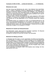 Drucksache 15/1838 (15/1592) Landtag des Saarlandes - 15. Wahlperiode - Ministerium der Justiz Seit dem Umzug des Ministeriums der Justiz in das Gebäude Franz-Josef-Röder- Straße 17 stehen im Mietobjekt ATRIUM für Mitarbeiterinnen und Mitarbeiter, Dienst- fahrzeuge und Besucher insgesamt 34 weitere PKW-Stellplätze in der Tiefgarage zur Verfügung. An der Ecke Franz-Josef-Röder-Straße zur Zähringerstraße (am Durch- gang von der Staatsanwaltschaft zum Landgericht) gibt es außerdem vier für das Mi- nisterium der Justiz reservierte Außenstellplätze. Im Übrigen stehen im Bereich des Ministeriums der Justiz insgesamt rd. 260 weitere Parkplätze zur Verfügung. Die Parkplätze sind abgeschrankt und können nur mit ei- nem Parkchip, der von den Bediensteten für 30,- € erworben werden kann, befahren werden. Die Parkplätze werden vom Landgericht (ca. 200), von der Staatsanwaltschaft (ca. 30) und von der Generalstaatsanwaltschaft (ca. 30) verwaltet. Sie können auch von den übrigen Mitarbeiterinnen und Mitarbeitern der Gerichte und der Behörden im Regie- rungsviertel genutzt werden. Eine mitarbeiterbezogene Parkplatzreservierung gegen Entgelt gibt es lediglich für 20 Parkplätze im ATRIUM. Ministerium für Umwelt und Verbraucherschutz Den Bediensteten werden gekennzeichnete Parkplätze zugewiesen. Für Besucher stehen separat ausgewiesene Parkplätze zur Verfügung. Es besteht ein Vertrag mit Q-Park über 30 Plätze in der Roonstraße. Ministerium für Bildung und Kultur Im Mietobjekt Alte Post stehen auf dem angemieteten Grundstück des Dienstgebäu- des 100 Parkplätze zur Verfügung. Ein weiteres Kontingent von 80 Parkplätzen stellt die Vermieterin solange zur Verfügung, bis sie mit den Arbeiten für ein weiteres Büro- gebäude beginnt. Die Nutzbarkeit dieser Parkplätze ist seit Bezug des Dienstgebäudes im April 2014 zeitweise eingeschränkt. Es wurden zusätzliche Parkplätze befristet bei Q-Park GmbH angemietet. Alle Mitarbeiter/-innen, die einen Parkplatz nutzen, zahlen einen einheitlichen Kostenbeitrag (Umlagesystem). Für die Außenstelle Am Bergwerk Reden (LDA) bestehen keine Verträge. Die Park- plätze gehören dem Land. -3-