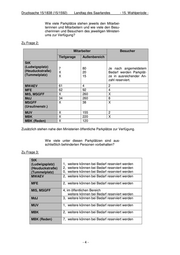 Drucksache 15/1838 (15/1592) Landtag des Saarlandes - 15. Wahlperiode - MUV 1.890,-€ (mtl.) MdJ Beim Ministerium der Justiz entstehen die Kosten für die Beschaf- fung von Parkchips. Die Kosten für die Abschrankungen und für die Unterhaltung der Liegenschaft werden vom Landesamt für Bau und Liegenschaften getragen. Für die Anmietung der Parkplätze im Atrium entstehen monatliche Kosten in Höhe von 2.506,14 € (mtl.). Auf den Kostenbeitrag der Mitarbeiter/-innen im Umlagesystem (Frage 6) wird hingewiesen. MBK Bei der Q-Park GmbH werden die Parkplätze zu einem Mengenra- batt angemietet. Die Kosten betragen zurzeit 3.360,-€ monatlich. Auf den Kostenbeitrag der Mitarbeiter/-innen im Umlagesystem (Frage 6) wird hingewiesen. MBK (Reden) Keine Werden die Kosten ganz oder teilweise an die Mitarbeiterinnen und Mitarbeiter oder andere Per- sonen weitergegeben? Wenn ja, in welchen Mini- sterien und in welcher Höhe? Zu Frage 6: Außenstellplatz Tiefgarage Chip/ Transponder StK (Ludwigsplatz) 0,-€ 20,-€ monatlich 0,-€ (Heuduckstraße) 0,-€ X 0,-€ (Tummelplatz) 0,-€ X 0,-€ MWAEV 10,-€ monatlich* 20,-€ monatlich 30,-€ MFE 0,-€ 20,-€ monatlich 26,-€ MIS 0,-€ 30,-€ MSGFF 7 - 17,-€ monatlich** X 30,-€ Ursulinenstraße Franz-Josef- Röder-Straße MdJ 0,-€ 20,-€ monatlich 30,-€ MUV 0,-€ X 0,-€ MBK 15,41 € monatlich*** X 0,-€ MBK (Reden) 0,-€ X 0,-€ * Die Außenstellplätze sind mit den Kennzeichen der Mieter beschildert. ** gestaffelt nach mittlerem, gehobenem und höherem Dienst *** zugewiesene Parkflächen; siehe auch Antwort zu Frage 7 -6-