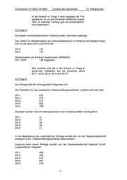 Drucksache 15/1926 (15/1894) Landtag des Saarlandes - 15. Wahlperiode - In der Antwort zu Frage 5 wird entgegen der Fra- gestellung nur zu den klinischen Sektionen ausge- führt. In welchem Umfang gab es rechtsmedizini- sche Sektionen? Zu Frage 3: Die beiden rechtsmedizinischen Institute wurden nochmals angefragt. Das Institut für Rechtsmedizin am Universitätsklinikum in Homburg teilt lediglich Anga- ben für die Jahre 2014 und 2015 mit: 2014 131 2015 127 Rechtsmedizin am Klinikum Saarbrücken (REMAKS) 2011-2015 129 insgesamt Wie verteilen sich die in der Antwort zu Frage 6 genannten Fallzahlen auf die einzelnen Jahre 2011, 2012, 2013, 2014 und 2015? Zu Frage 4: Auf Anfrage teilt die Vollzugspolizei Folgendes mit: Die Fallzahlen für das „klassische Todesermittlungsverfahren“ verteilen sich wie folgt: 2011 527 2012 573 2013 617 2014 652 2015 708 Daneben wurden noch Ermittlungsverfahren bei Verkehrsunfällen durchgeführt: 2011 41 2012 37 2013 39 2014 29 2015 31 In der Bearbeitung der ursprünglichen Anfrage wurden die von der Staatsanwaltschaft erfassten 3.201 Todesermittlungsverfahren dokumentiert. Aufgrund einer neuen Anfrage wurden von der Staatsanwaltschaft folgende Ermitt- lungsverfahren mitgeteilt: 2011 490 2012 560 2013 615 2014 641 2015 676 -2-