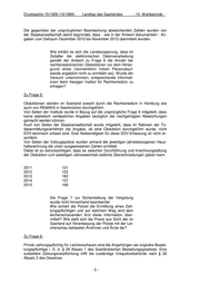 LANDTAG DES SAARLANDES 15. Wahlperiode Drucksache 15/1926 (15/1894) 12.09.2016 ANTWORT zu der Anfrage der Abgeordneten Astrid Schramm (DIE LINKE.) betr.: Nachfrage zur Antwort der Landesregierung auf die Anfrage „Leichenschau im Saarland“ [Drucksache 15/1686 (15/1618)] Vorbemerkung der Fragestellerin: Die unzureichende Beantwortung meiner Anfrage zur Leichenschau im Saarland erfordert weitere Nachfragen. Wann ist mit Ergebnissen der von der Landesre- gierung gemäß Antwort zu Frage 1 in Auftrag ge- gebenen Studie zu rechnen? Zu Frage 1: Die Studie befindet sich zum momentanen Zeitpunkt im Endstadium der Datenerfas- sung, dies bedeutet, dass etwa 10.000 der annähernd 12.500 Todesbescheinigungen erfasst sind. Ab Oktober ist eine erste Sichtung der Daten und eine erste orientierende statistische Auswertung geplant, deren Ergebnisse im Januar 2017 vorliegen. Welche Konsequenzen hatten die gemäß Antwort zu Frage 4 aufgeführten Abweichungen der Klas- sifikation der Todesart? Wurde in den erwähnten 60 Fällen auch obduziert? Wenn ja, waren das kli- nische oder rechtsmedizinische Obduktionen? Zu Frage 2: Nach den hier vorliegenden Informationen wurde bei den erwähnten 60 Fällen zu- nächst keine Bescheinigung zur Einäscherung ausgestellt. Die Fälle wurden der Poli- zei gemeldet. Nach Abschluss der Ermittlungen und Freigabe der Leiche durch die Polizei oder Staatsanwaltschaft wurde eine entsprechende Bescheinigung zur Einäscherung aus- gestellt. Bei einem „angehaltenen“ Leichnam wurde eine Obduktion durchgeführt. Hierbei handelt es sich um eine rechtsmedizinische Obduktion. Ausgegeben: 12.09.2016 (07.07.2016)