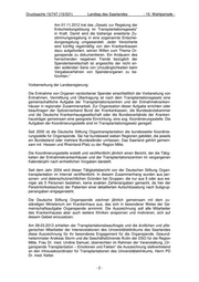 Drucksache 15/747 (15/331) Landtag des Saarlandes ___- 15. Wahlperiode - Zu Frage 9a: Im Rahmen des Spitzengesprächs zum Organspendeskandal vom 27.08.2012 wurde auch beschlossen, dass die Jahresberichte der Prüfkommission und der Überwa- chungskommission sowohl dem Bundestag als auch der Öffentlichkeit zugänglich ge- macht werden sollen. Dies erfolgte über eine Veröffentlichung auf der Homepage der Bundesärztekammer unter http://www.baek.de/page.asp?his=0.6.3285.10746. Ebenfalls veröffentlicht wurde unter http://www.baek.de/page.asp?his=0.6.3285.10747 eine Dokumentation der Prü- fung von Allokationsauffälligkeiten bis dato (abgeschlossene Fälle). Nicht veröffent- licht, aber am 22. August auf Arbeitsebene versendet, wurde die Aufschlüsselung, welche laufende Prüfungsnummer welchem Transplantationszentrum zugeordnet ist. Dabei hat sich gezeigt, dass das Transplantationszentrum am Universitätsklinikum im Zeitraum von 2000 bis 2011 drei Mal Inhalt einer Meldung war, die von der Prüfungs- kommission geprüft wurde. b) Wenn ja, um welche Vorwürfe handelte es sich dabei, welche Ermittlungen wurden in den jeweiligen Fällen eingeleitet und welche Konsequenzen hat die Landesregierung aus den Ermittlungsergebnissen gezogen? Zu Frage 9b: Folgende drei Fälle waren in o.g. Zeitraum von 2000 bis 2011 Inhalt einer Meldung, die von der Prüfungskommission geprüft wurde: 2004 2004 informierte Eurotransplant (ET) über die Abmeldung eines Homburger TPZ („Abmeldung eines TPZ für einen Tag, da „No transplant surgeon available.“). Mit ET wurde von der Kommission folgende Regelung vereinbart: Die Kommission ist erst dann zu informieren, wenn Transplantationsprogramme länger als eine Woche oder mehrmals innerhalb eines Halbjahres abgemeldet werden. 2007 2007 berichtete ET, ein Auditor habe Auffälligkeiten im Zuge eines Urgency (U-) – Meldeverfahrens zur Lungentransplantation (Lungen-Tx) festgestellt. Bei Einreichung von Originaldokumenten eines TPZ zur Verlängerung des U-Status zur Lungen-Tx seien Veränderungen in den Kopien der Originalunterlagen bemerkt worden. Verglei- che der vom TPZ bei ET eingereichten Originaldokumente mit Kopien, die für die Ver- längerung des U-Status eingereicht worden seien, deuteten auf eine Datenmanipulati- on hin. Die Kommission hat hierzu eine Stellungnahme des Organsachverständigen angefor- dert und auch die Ärzte im TPZ hierzu angehört und die Folgen von fahrlässiger oder absichtlich unzutreffender Angaben in entsprechenden Anträgen sowie die Dokumen- tationsverpflichtungen klargestellt. Das TPZ hat nach der Anhörung durch die Kommission die Durchführung organisatori- scher Maßnahmen zur künftigen Vermeidung ähnlicher Vorkommnisse bestätigt. -6-