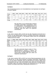 LANDTAG DES SAARLANDES 15. Wahlperiode Drucksache 15/747 (15/331) 28.01.2014 ANTWORT zu der Anfrage der Abgeordneten Dr. Simone Peter (B90/Grüne) betr.: Organtransplantationen im Saarland Vorbemerkung der Fragestellerin: „Erneut wurde das Vertrauen in die Transplantati- onsmedizin in Deutschland zu Beginn dieses Jah- res durch schwere Missstände an der Universi- tätsklinik in Leipzig erschüttert. Bei 37 der 182 Pa- tienten, denen in den Jahren 2010 und 2011 eine Spenderleber transplantiert wurde, wurden Daten manipuliert, um die Patienten schwerer erkrankt erscheinen zu lassen, als sie tatsächlich waren. Sie bekamen infolge der bewusst fehlerhaften An- gabe ihres Gesundheitszustandes von der Organ- vermittlungsstelle Eurotransplant schneller eine neue Leber zugeteilt. Diesen aktuellen Manipulati- onen voraus gingen Vorwürfe der Bevorzugung von Wartelisten-PatientInnen aufgrund manipulier- ter Angaben an den Universitätskliniken Göttin- gen, Regensburg und München sowie der Ver- dacht einer Bevorzugung von PrivatpatientInnen bei der Vergabe von Spenderlebern im vergange- nen Jahr. Der Bericht der Bundesregierung zur Si- tuation der Transplantationsmedizin in Deutsch- land zehn Jahre nach Inkrafttreten des Transplan- tationsgesetzes zeigt zudem weitere Bereiche auf, in denen sich die Organverteilung grundsätzlich als manipulationsanfällig erweist (siehe Bundes- tags-Drucksache 16/ 13740, S.66 f). Die zögerli- che Wahrnehmung der Kontrollfunktionen durch die vorhandenen Institutionen führte in der Ver- gangenheit dazu, dass Rechtsverstöße letztlich geduldet und nicht sanktioniert wurden. Die Spen- denbereitschaft der Bevölkerung ist daraufhin deutlich zurückgegangen, da Unsicherheit und Skepsis gegenüber den Vergabeverfahren herr- schen. Ausgegeben: 28.01.2014 (31.01.2013)