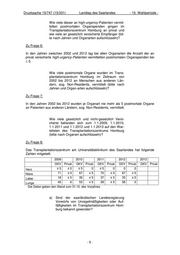 Drucksache 15/747 (15/331) Landtag des Saarlandes ___- 15. Wahlperiode - Wie viele Organe wurden in den Jahren 2002 bis 2012 im Transplantationszentrum der Universi- tätsklinik des Saarlandes jeweils transplantiert (bit- te nach Jahren und Organarten aufschlüsseln)? Zu Frage 1: Das Transplantationszentrum am Universitätsklinikum des Saarlandes hat nachfolgen- de Zahlen mitgeteilt. Organ 2002 2003 2004 2005 2006 2007 2008 2009 2010 2011 2012 Niere 17 27 27 26 19 18 12 23 31 18 17 Herz 1 1 ≤5 ≤5 ≤5 ≤5 0 ≤5 ≤5 0 0 Lunge 8 8 12 10 11 12 22 14 15 23 15 Leber 4 6 ≤5 12 12 19 12 10 30 15 11 Wie viele dieser postmortalen Organspenden gin- gen in den Jahren 2002 bis 2012 im Transplanta- tionszentrum Homburg jeweils an privat versicher- te und wie viele an gesetzlich versicherte Empfän- ger (bitte nach Jahren und Organarten aufschlüs- seln)? Zu Frage 2: Das Transplantationszentrum am Universitätsklinikum des Saarlandes hat nachfolgen- de Zahlen mitgeteilt. Organ 2002 2003 2004 2005 2006 2007 2008 2009 2010 2011 2012 Niere 13 20 n.e. 25 13 15 11 21 26 16 16 gesetzlich 3 1 n.e. ≤5 6 ≤5 ≤5 ≤5 ≤5 ≤5 <5 privat Herz 0 1 ≤5 ≤5 ≤5 ≤5 0 ≤5 ≤5 0 0 gesetzlich 1 0 0 0 0 0 0 0 0 0 0 privat Lunge 6 6 ≤12 ≤10 ≤10 8 21 12 13 22 14 gesetzlich 2 2 ≤5 ≤5 ≤5 ≤5 ≤5 ≤5 ≤5 ≤5 <5 privat Leber 3 6 ≤5 10 12 19 10 7 30 15 7 gesetzlich 1 0 0 ≤5 0 0 ≤5 ≤5 0 0 <5 privat n.e.: nicht erfasst, keine Angabe möglich Wie viele postmortale Organe wurden in Homburg im Zeitraum von 2002 bis 2012 im sog. beschleu- nigten Verfahren als „Zentrumsangebote“ vermit- telt (bitte nach Jahren und Organarten aufschlüs- seln)? -3-