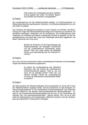 Drucksache 15/615 (15/522) Landtag des Saarlandes - 15. Wahlperiode - Falls seitens der Landesregierung keine Veröffent- lichung geplant sein sollte, mit welcher Begrün- dung werden die Antworten zurückgehalten? Zu Frage 2: Die Landesregierung hat den Wissenschaftsrat gebeten, ein Strukturgutachten zur Weiterentwicklung des saarländischen Hochschul- und Wissenschaftssystems bis zum Jahr 2020 zu erstellen. Das Verfahren der Begutachtung besteht aus einer Vielzahl von Schritten. Die Beant- wortung der Fragen des Wissenschaftsrates erfolgt durch Antworten auf mündliche und schriftliche Nachfragen, Gespräche und Vor-Ort-Besuche. Die Veröffentlichung einer Teiltranche von Antworten aus diesem umfassenden Prozess ist losgelöst von der Ge- samtbetrachtung und würde dem Leser eine vollständige Information suggerieren, die dieser Teiltranche nicht inne wohnt. Wurden die Antworten auf die Fragenkataloge des Wissenschaftsrates der beteiligten Hochschulen und der Landesregierung wechselseitig ausge- tauscht? Falls nein, wieso werden die beteiligten Partner nicht wechselseitig über ihre Antworten in- formiert? Zu Frage 3: Das Land und seine Hochschulen haben wechselseitig die Antworten auf die jeweiligen Fragen des Wissenschaftsrates ausgetauscht. Ist seitens der Landesregierung eine öffentliche Diskussion über die Zukunft der saarländischen Hochschullandschaft geplant? Falls ja, wie und wann soll sie gestaltet werden? Falls nein, aus welchen Gründen möchte die Landesregierung von einer die Öffentlichkeit einbeziehenden Debat- te absehen? Zu Frage 4: Die Stellungnahme des Wissenschaftsrates wird voraussichtlich im Januar 2014 durch den Wissenschaftsrat vorgelegt werden. Ziel des Gutachtens ist das Aufzeigen von Entwicklungsperspektiven für die saarländische Hochschullandschaft. Das Gutachten soll dann folgend für die weiteren wissenschaftspolitischen Weichenstellungen - so- wohl für die Landeshochschulentwicklungsplanung als auch für die Vorbereitung der nächsten Ziel- und Leistungsvereinbarungen - genutzt werden. Dort, wo es je nach Inhalt der Stellungnahme und Empfehlungen zielführend erscheint, wird die Landesre- gierung entsprechend in Diskussionen einsteigen. -2-