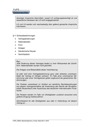 FoPS Datenrechte derartiger Ansprüche übermitteln, soweit LG verfügungsberechtigt ist und wesentliche Interessen der LG nicht entgegenstehen. LG und LN werden sich wechselseitig über geltend gemachte Ansprüche informieren. § 11 Schlussbestimmungen • Vertragsänderungen • Nebenabreden • Form • Anlagen • Salvatorische Klausel • Gerichtsstand Bsp.: Jede Änderung dieses Vertrages bedarf zu ihrer Wirksamkeit der Schrift- form. Nebenabreden wurden nicht getroffen. Die Anlagen sind Bestandteile dieser Vereinbarung. Ist oder wird eine Vertragsbestimmung ganz oder teilweise unwirksam, bleibt der Vertrag im Übrigen wirksam. Im Falle einer unwirksamen Be- stimmung oder einer Vertragslücke gelten ergänzend die gesetzlichen Be- stimmungen. Die Parteien vereinbaren im Hinblick auf sämtliche Rechtsbeziehungen aus diesem Vertragsverhältnis die Anwendung des Rechts der Bundesre- publik Deutschland unter Ausschluss des deutschen Internationalen Privat- rechts. Die Parteien werden im Falle von Streitigkeiten zunächst versuchen eine gütliche Einigung herbeizuführen. Gerichtsstand für alle Streitigkeiten aus oder in Verbindung mit diesem Vertrag ist … FoPS_70825_Abschlussbericht_v10.doc; Stand 26.11.2010