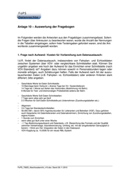 FoPS Datenrechte Anlage 10 – Auswertung der Fragebogen Im Folgenden werden die Antworten aus den Fragebögen zusammengefasst. Sofern die Fragen über Ankreuzen zu beantworten waren, wurde die Anzahl der Nennungen in die Tabellen eingetragen, sofern freie Texteingaben gefordert waren, sind die Ant- worttexte zusammengestellt worden. 1. Frage nach Aufwand / Kosten für Vorbereitung zum Datenaustausch: I.d.R. findet der Datenaustausch, insbesondere von Fahrplan- und Echtzeitdaten zwischen Systemen über VDV- oder vergleichbare Schnittstellen statt. Können Sie ungefähr angeben wie hoch der Aufwand für das Einrichten einer Schnittstelle (nach VDV-Standard) ist? Angaben dazu können sowohl in Personalstunden/-tagen oder monetär erfolgen, auch Schätzungen helfen. Falls der Aufwand nach Art der auszu- tauschenden Daten (z.B. Fahrplan- vs. Echtzeitdaten) oder anderen Kriterien stark differiert, bitte angeben. − Geschätzte Werte Ist-Daten Schnittstelle: 10 Manntage beim Verbund + diverse Tage bei VU / Systemlieferant. 14 Tage bis 1 Monat auf Seiten des Verbundes (Abstimmung mit Bahn) 6 Monate für Test- und dreimonatigen Probebetrieb seitens der Bahn − Geschätzte Werte Soll-Daten Schnittstellen: 7 Tage wenn alles sehr gut läuft 2-3 Wochen für Soll-Daten-Schnittstelle pro Unternehmen (Zuordnungstabellen etc.) − − Allgemein: − 3-4 Tage bei Standardschnittstellen − 50.000 DM + davon 50% Ingenieurstunden für Lieferanten und Betreiber (VGF). Dazu gehören auch Gespräche mit Datenlieferanten und Datenabnehmern, Einrichtung von Zuordnungstabellen, eigene Kosten − 1 Stunde zum Einrichten − wenn alles gut läuft unter einer Woche − ~1 Tag Abstimmungsaufwand und Datentests, z.B. Überprüfung des Formats und der Qualität (stimmen Verkehrstage, Georeferenzierung, Umfang, etc. mit der eingeforderten Genauigkeit ü- berein) ~10min pro Hst: Integration der Daten in den Datenpool. − VDV-Kopplung ca. 15.000€ für ein neues RBL-System FoPS_70825_Abschlussbericht_v10.doc; Stand 26.11.2010