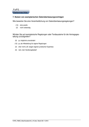 FoPS Datenrechte 7. Nutzen von exemplarischen Datenüberlassungsverträgen Wie bewerten Sie eine Vereinheitlichung von Datenüberlassungsregelungen? (12) eher positiv (2) nicht notwendig Würden Sie auf exemplarische Regelungen oder Textbausteine für die Vertragsges- taltung zurückgreifen? (0) ja, möglichst unverändert (12) ja, als Hilfestellung für eigene Regelungen (2) eher nicht (z.B. wegen eigener juristischer Expertise) (0) nein, kein Handlungsbedarf FoPS_70825_Abschlussbericht_v10.doc; Stand 26.11.2010