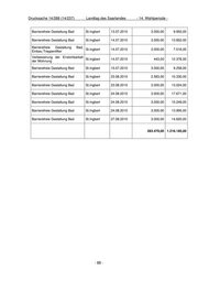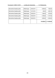 Drucksache 14/288 (14/237) Landtag des Saarlandes - 14. Wahlperiode - Barrierefreie Gestaltung Bad Wallerfangen 30.06.2010 3.000,00 7.834,00 Barrierefreie Gestaltung Bad Wallerfangen 13.07.2010 443,00 6.581,00 Barrierefreie Gestaltung Bad Wallerfangen 23.08.2010 1.394,00 5.575,00 Barrierefreie Gestaltung Bad Wallerfangen 23.08.2010 2.769,00 11.077,00 Barrierefreie Gestaltung Bad Wallerfangen 25.08.2010 3.000,00 12.323,00 516.902,92 2.116.835,68 - 83 -