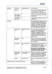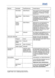 AtßlS Element Parameter Typ/Erläuterung Unterbringung Rubrum In den XJustiz-Verfahrensdaten gibt es das Element „Kurzrubrum". Ergänzung wenn unzureichend. Aktenzeichen Wird im Nachrichtenkopf im Element der Anwälte mitgegeben. 1 1 Aktenzeichen Wird im Nachrichtenkopf im Element 1 der Justiz mitgegeben. Anhänge Die Anhänge/Attachments werden in der OSCI-Nachricht angegeben. Die Zuweisung zu Akten und Vorgängen erfolgt in XJustiz über das Element „XDOMEA". Die Zuordnung zu den Fachdatensätzen wird über Referen- zen in den Fachdaten umgesetzt. Anhangsnum- 1 Identifikationsnum- Ist in der Regel die Dokumenten-ID mer aus einer Akte. Diese wird im Un- 1 mer terelement „ID" des Elementes 1 „XDOMEA" mitgegeben. Mittels Un- 1 terelement „Anlagennummer" kann im 1 „XDOMEA"-Element die laufende Nummer aus den Attachments ange- geben werden. Anhangsbe- Text Eine Beschreibung der Attachments zeichner erfolgt in den OSCl-Nutzungsdaten und im Unterelement „Beschreibung" aus „XDOMEA". 1 Anhangstyp Typ des Dokumen- Eine Beschreibung des Typs der Atta- tes chrnents erfolgt in den OSCI- Nutzungsdaten und im Unterelement „Beschreibung" aus „XDOMEA". 1 1 1 ' Hier müssen in X.Justiz eigene 1 Wertelisten erstellt oder die vor- 1 1 l handenen erweitert werden. f Zugeordneter Liste mit Verweisen I Werden im Unterelement „ldentifizie- i 1 Nachrichten- ' zu Anhängen rung" des Elementes „XDOMEA" an- 1 1 anteil 1 gegeben. Ein Verweis auf einen An- hang gibt es auch in den Fachdaten i 1 1 über das Element „Ref_Dok_ID". 1 f Inhalt Das Dokument Wird als Anhang/Attachment übertra- 1 gen. 1 1 1 Nachrichtenjournal (Historie der Nachricht) ' Wird aus dem OSCI-Laufzettel der 1 Nachricht und den Nutzeraktionen in- nerhalb des beA-Clients gebildet. © Copyright 2014 Atos IT Solutions and Services GmbH Seite 26 Angebot - BRAK - beA - Umsetzungskonzept, 02 .09 .2014