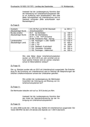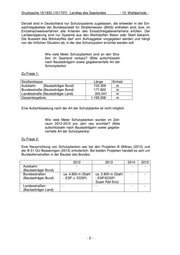 Drucksache 15/1832 (15/1707) Landtag des Saarlandes - 15. Wahlperiode - Inwieweit hat die Landesregierung Kenntnis über die Verbreitung von Unterfahrschutzsystemen (Bit- te um Auflistung nach Straßenarten)? Wie viele Meter Schutzplanken mit Unterfahrschutz sind im Saarland vorhanden (Bitte aufschlüsseln nach Baulastträgern)? Zu Frage 9: Autobahn A 8, AS Perl und AS NK Oberstadt ca. 300 m (Baulastträger Bund) (Anschlussstellen) Bundes-straßen B 41 bei Nohfelden ca. 100 m (Baulastträger Bund) B 269 bei Oberfelsberg ca. 220 m B 41 / L 129, KVP Sinnerthal ca. 120 m B 406, Potsdamer Platz - Nennig ca. 720 m Landesstraßen L 108 Fechingen / L 236 / Staffel ca. 1100 m (Baulastträger Land) L 108 / L 237 ca. 600 m L 108 / L 107 ca. 200m L 234, Seelbach- N.würzbach ca. 500 m L 130, Urexweiler- Hirzweiler ca. 550 m L 105, Fechingen - Habkirchen ca. 500 m Wie viele Meter dieser Unterfahrschutzplanken wurden von 2012–2015 pro Jahr errichtet und an- hand welcher Kriterien wird ein solcher Unterfahr- schutz für Motorradfahrer verbaut? Zu Frage 10: Die v.g. Strecken wurden alle vor 2012 mit Unterfahrschutz ausgerüstet. Die Entschei- dung für die Errichtung von Unterfahrschutz wird im Rahmen der Besprechungen der örtlichen Unfallkommissionen anhand der Unfallzahlen getroffen. Wie schätzt die Landesregierung die Mehrkosten hinsichtlich der Anbringung und Wartung von Un- terfahrschutzsystemen ein? Zu Frage 11: Die Mehrkosten belaufen sich auf ca. 30 € (brutto) pro lfdm. Inwieweit hat die Landesregierung Kenntnis über den Anteil der Spendenfinanzierung bei der An- bringung von Unterfahrschutzsystemen? Zu Frage 12: Im Jahre 2008 wurde die L 108 (der sog. Staffel) mit Unterfahrschutz ausgerüstet. Der Verein MEHRSI hat dem LfS damals eine Spende von 1.000 € überreicht. -5-