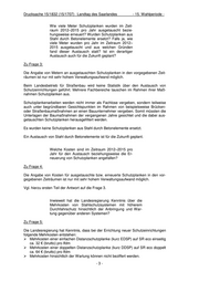 Drucksache 15/1832 (15/1707) Landtag des Saarlandes - 15. Wahlperiode - Wie viele Meter Schutzplanken wurden im Zeit- raum 2012–2015 pro Jahr ausgetauscht bezie- hungsweise erneuert? Wurden Schutzplanken aus Stahl durch Betonelemente ersetzt? Falls ja, wie viele Meter wurden pro Jahr im Zeitraum 2012– 2015 ausgetauscht und aus welchen Gründen fand dieser Austausch statt? Ist ein derartiger Austausch auch für die Zukunft geplant? Zu Frage 3: Die Angabe von Metern an ausgetauschten Schutzplanken in den vorgegebenen Zeit- räumen ist nur mit sehr hohem Verwaltungsaufwand möglich. Beim Landesbetrieb für Straßenbau wird keine Statistik über den Austausch von Schutzeinrichtungen geführt. Mehrere Fachbereiche tauschen im Rahmen ihrer Maß- nahmen Schutzplanken aus. Schutzplankenarbeiten werden nicht immer als Fachlose vergeben, sondern teilweise auch unter begründbaren Gesichtspunkten im Rahmen von beispielsweise Brücken- oder Straßenbaumaßnahmen an einen Bauunternehmer vergeben. Somit müssten die Unterlagen der Baumaßnahmen der vergangenen Jahre gesichtet und die dabei aus- getauschten Schutzplanken herausgefiltert werden. Es wurden keine Schutzplanken aus Stahl durch Betonelemente ersetzt. Ein Austausch von Stahl durch Betonelemente ist für die Zukunft geplant. Welche Kosten sind im Zeitraum 2012–2015 pro Jahr für den Austausch beziehungsweise die Er- neuerung von Schutzplanken angefallen? Zu Frage 4: Die Angabe von Kosten für ausgetauschte bzw. erneuerte Schutzplanken in den vor- gegebenen Zeiträumen ist nur mit sehr hohem Verwaltungsaufwand möglich. Vgl. hierzu ersten Teil der Antwort auf die Frage 3. Inwieweit hat die Landesregierung Kenntnis über die Mehrkosten von Stahlschutzsystemen mit höherem Durchfahrschutz hinsichtlich der Anbringung und War- tung gegenüber anderen Systemen? Zu Frage 5: Die Landesregierung hat Kenntnis, dass bei der Errichtung neuer Schutzeinrichtungen folgende Mehrkosten entstehen: Mehrkosten einer einfachen Distanzschutzplanke (kurz EDSP) auf SR eco einseitig ca. 32 € (brutto) pro lfdm Mehrkosten einer doppelten Distanzschutzplanke (kurz DDSP) auf SR eco doppelt ca. 64 € (brutto) pro lfdm Mehrkosten hinsichtlich der Wartung können nicht beziffert werden. -3-