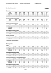 Drucksache 15/294 (15/247) Landtag des Saarlandes - 15. Wahlperiode - Landesarbeitsgericht* Anlage 3 Berufungen Jahr 2004 2005 2006 2007 2008 2009 2010 2011 Eingänge 187 152 160 153 150 109 120 126 Erledigungen 159 162 147 158 149 120 125 125 Endbestand 87 77 90 85 86 75 70 71 Durchschnittliche Verfahrensdauer Jahr 2004 2005 2006 2007 2008 2009 2010 2011 Monate 5,6 6,2 6,1 7,3 7,1 7,2 8,3 6,4 Beschwerden in Beschlusssachen Jahr 2004 2005 2006 2007 2008 2009 2010 2011 Eingänge 8 16 8 19 80 11 11 17 Erledigungen 4 16 10 12 46 45 13 14 Endbestand 7 7 5 11 44 8 5 8 Durchschnittliche Verfahrensdauer Jahr 2004 2005 2006 2007 2008 2009 2010 2011 Monate 9,0 5,6 5,3 5,5 5,4 11,7 4,5 4,1 Sonstige Beschwerden Jahr 2004 2005 2006 2007 2008 2009 2010 2011 Eingänge 53 20 42 54 43 33 48 46 *) seit 2007 neue Erhebungsgrundlagen Finanzgericht Klagen Jahr 2004 2005 2006 2007 2008 2009 2010 2011 Eingänge 640 560 520 484 511 526 491 367 Erledigungen 581 524 500 462 612 570 611 506 Endbestand 714 750 770 797 715 668 550 414 Durchschnittliche Verfahrensdauer Jahr 2004 2005 2006 2007 2008 2009 2010 2011 Monate 13,5 15,7 13,7 18,9 18,4 21,5 20,1 18,4 Verfahren zur Gewährung von vorläufigem Rechtsschutz Jahr 2004 2005 2006 2007 2008 2009 2010 2011 Eingänge 174 151 183 170 139 160 156 87 Erledigungen 189 128 125 259 147 165 145 94 Endbestand 43 66 124 35 27 22 34 27 Durchschnittliche Verfahrensdauer Jahr 2004 2005 2006 2007 2008 2009 2010 2011 Monate 3,2 2,9 5,6 6,4 2,8 2,4 2,3 2,3 - 31 -