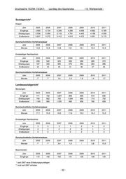 Drucksache 15/294 (15/247) Landtag des Saarlandes - 15. Wahlperiode - Sozialgericht* Klagen Jahr 2005 2006 2007 2008 2009 2010 2011 Eingänge 4.555 4.734 5.248 4.290 4.009 4.662 4.780 Erledigungen 5.538 5.099 5.116 4.761 4.445 4.188 4.558 Endbestand 5.637 5.272 5.412 4.910 4.475 4.951 5.175 Durchschnittliche Verfahrensdauer Jahr 2005 2006 2007 2008 2009 2010 2011 Monate 14,6 13,8 12,8 13,1 13,1 13,0 12,3 Einstweiliger Rechtsschutz Jahr 2005 2006 2007 2008 2009 2010 2011 Eingänge 209 342 323 262 289 285 272 Erledigungen 187 332 325 275 284 284 286 Endbestand 34 45 45 31 36 37 23 Durchschnittliche Verfahrensdauer Jahr 2005 2006 2007 2008 2009 2010 2011 Monate /** /** 1,6 1,8 1,6 1,4 1,7 Landessozialgericht* Berufungen Jahr 2005 2006 2007 2008 2009 2010 2011 Eingänge 771 752 1.004 866 666 515 630 Erledigungen 750 922 755 1.094 690 713 752 Endbestand 1.160 990 1.225 983 958 760 639 Durchschnittliche Verfahrensdauer Jahr 2005 2006 2007 2008 2009 2010 2011 Monate 17,1 15,9 16,5 11,6 15,5 14,3 13,2 Einstweiliger Rechtsschutz Jahr 2005 2006 2007 2008 2009 2010 2011 Eingänge 3 0 3 1 2 4 0 Erledigungen 3 0 2 2 0 1 3 Endbestand 0 0 1 0 2 3 0 Durchschnittliche Verfahrensdauer Jahr 2005 2006 2007 2008 2009 2010 2011 Monate /** /** 2,4 1,9 / 2,8 13,0 Beschwerden Jahr 2005 2006 2007 2008 2009 2010 2011 Eingänge 172 192 163 151 126 138 130 *) seit 2007 neue Erhebungsgrundlagen **) erst seit 2007 erhoben - 32 -