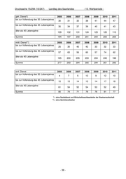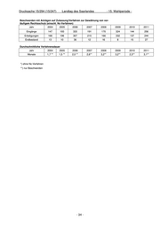 Drucksache 15/294 (15/247) Landtag des Saarlandes - 15. Wahlperiode - Beschwerden mit Anträgen auf Zulassung/Verfahren zur Gewährung von vor- läufigem Rechtsschutz (einschl. Nc-Verfahren) Jahr 2004 2005 2006 2007 2008 2009 2010 2011 Eingänge 147 193 333 191 170 324 144 256 Erledigungen 166 196 307 215 166 332 137 244 Endbestand 13 10 36 12 16 8 15 27 Durchschnittliche Verfahrensdauer Jahr 2004 2005 2006 2007 2008 2009 2010 2011 Monate 1,7 ** 1,5 ** 2,0 ** 2,6** 3,2** 3,2** 2,3** 3,1** *) ohne Nc-Verfahren **) nur Beschwerden - 34 -