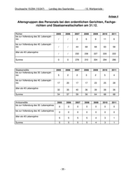Drucksache 15/294 (15/247) Landtag des Saarlandes - 15. Wahlperiode - Anlage 4 Altersgruppen des Personals bei den ordentlichen Gerichten, Fachge- richten und Staatsanwaltschaften am 31.12. Richter 2005 2006 2007 2008 2009 2010 2011 bis zur Vollendung des 30. Lebensjah- res / / 2 6 9 11 6 bis zur Vollendung des 40. Lebensjah- res / / 44 68 68 63 58 älter als 40 Lebensjahre / / 232 236 227 220 222 Summe 0 0 278 310 304 294 286 Staatsanwälte 2005 2006 2007 2008 2009 2010 2011 bis zur Vollendung des 30. Lebensjah- res 5 2 2 3 2 5 4 bis zur Vollendung des 40. Lebensjah- res 17 20 17 17 23 25 28 älter als 40 Lebensjahre 32 35 40 36 39 38 36 Summe 54 57 59 56 64 68 68 Amtsanwälte 2005 2006 2007 2008 2009 2010 2011 bis zur Vollendung des 30. Lebensjahres 0 0 0 0 0 0 0 bis zur Vollendung des 40. Lebensjahres 0 0 0 0 0 0 0 älter als 40 Lebensjahre 5 5 5 5 4 3 1 Summe 5 5 5 5 4 3 1 - 35 -