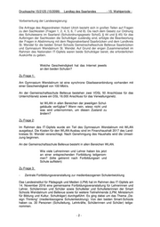 Drucksache 15/2125 (15/2099) Landtag des Saarlandes - 15. Wahlperiode - Vorbemerkung der Landesregierung: Die Anfrage des Abgeordneten Hubert Ulrich bezieht sich in großen Teilen auf Fragen zu den Sachkosten (Fragen 1, 2, 4, 5, 6, 7 und 8). Da nach dem Gesetz zur Ordnung des Schulwesens im Saarland (Schulordnungsgesetz SchoG, § 44 und § 45) für das Aufbringen der Sachkosten die Schulträger zuständig sind, erfolgte die Beantwortung der Fragen in Abstimmung mit dem Regionalverband Saarbrücken und dem Landkreis St. Wendel für die beiden Smart Schools Gemeinschaftsschule Bellevue Saarbrücken und Gymnasium Wendalinum St. Wendel. Auf Grund der engen Zusammenarbeit im Rahmen des Nationalen IT-Gipfels waren beide Schulträger bereit, die erforderlichen Auskünfte zu geben. Welche Geschwindigkeit hat das Internet jeweils an den beiden Schulen? Zu Frage 1: Am Gymnasium Wendalinum ist eine synchrone Glasfaseranbindung vorhanden mit einer Geschwindigkeit von 100 Mbit/s. An der Gemeinschaftsschule Bellevue bestehen zwei VDSL 50 Anschlüsse für das Unterrichtsnetz sowie ein DSL 16.000 Anschluss für das Verwaltungsnetz. Ist WLAN in allen Bereichen der jeweiligen Schul- gebäude verfügbar? Wenn nein, wieso nicht und was wird unternommen, um diesen Zustand zu ändern? Zu Frage 2: Im Rahmen des IT-Gipfels wurde ein Teil des Gymnasium Wendalinum mit WLAN ausgebaut. Die Kosten für den WLAN-Ausbau sind im Finanzhaushalt 2017 des Land- kreises St. Wendel veranschlagt. Nach Genehmigung des Haushalts wird die Umset- zung beginnen. An der Gemeinschaftsschule Bellevue besteht in allen Bereichen WLAN. Wie viele Lehrerinnen und Lehrer haben bis jetzt an einer entsprechenden Fortbildung teilgenom- men? (bitte getrennt nach Fortbildungsart und Schule auflisten) Zu Frage 3: - Zentrale Fortbildungsveranstaltung zur medienbezogenen Schulentwicklung Das Landesinstitut für Pädagogik und Medien (LPM) hat im Rahmen des IT-Gipfels am 14. November 2016 eine gemeinsame Fortbildungsveranstaltung für Lehrerinnen und Lehrer, Schülerinnen und Schüler sowie Schulleiter und Schulleiterinnen der Smart Schools Wendalinum und Bellevue sowie für weitere Teilnehmende (LPM, Ministerium für Bildung und Kultur, Schulträger) durchgeführt. Es ging dabei um das Thema „De- sign Thinking“ (medienbezogene Schulentwicklung). Von den beiden Smart-Schools haben ca. 30 Personen (Schulleitung, Lehrkräfte, Schülerinnen und Schüler) teilge- nommen. -2-