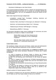 Drucksache 15/2125 (15/2099) Landtag des Saarlandes - 15. Wahlperiode - - Schulinterne Fortbildungen an den Smart Schools An der Gemeinschaftsschule Bellevue werden im Rahmen der Schulentwicklung inter- ne Fortbildungsmodule für die Dauer von 1,5 Stunden von Lehrkräften während des Schultages durchgeführt. Ziel ist es, die pädagogische Nutzung der Geräte und Soft- ware darzustellen. Bisher haben folgende Schulungen stattgefunden: - Lernplattform „Lernwelt Saar“: Grundlagen, Vertiefung, Autorinnen und Autorenschulung (12 Schulungen) - Interaktive Tafeln „Smart Board“ (3 Schulungen) und „Starboard“ (1 Schulung) - Autorinnen- und Autorenwerkzeug „Master Tool“ (1 Schulung) - Tabletschulung für Windows 10/HP Manager“ (1 Schulung) - Netzwerklösung „MNSPro“ (1 Schulung) Am Gymnasium Wendalinum finden interne Fortbildungen für Lehrerinnen und Lehrer insbesondere zum Einsatz von Tablets im Unterricht statt. Welche Mittel mussten die Smart Schools bis jetzt jeweils für die Ausstattung und die Fortbildungen investieren? Wie viele dieser Kosten wurden durch die Unter- stützung von IT-Unternehmen übernommen? Zu den Fragen 4 und 6: Die Investitionen erfolgen nicht durch die Schulen, sondern durch die Sachkostenträ- ger, hier der Regionalverband Saarbrücken und der Landkreis St. Wendel. Folgende Mittel wurden bisher außerplanmäßig vom Landkreis St. Wendel für die Ausstattung der Smart School Gymnasium Wendalinum im Rahmen des IT-Gipfels bereitgestellt: - ca. 9.500 € Ausstattung mit Windows Tablets im Rahmen des IT-Gipfels (vergünstigtes Angebot von HP, der normale Listenpreis lag bei 29.500 €). - ca. 800 € für die Schaffung einer WLAN-Struktur für den Einsatz der digitalen Geräte. - ca. 7.000 € lt. Angebot für die Anbindung der 100 Mbit/s Internetverbindung bis zum Hausanschluss. Die genauen Zahlen hierzu sind noch nicht bekannt, da die Endrechnung noch nicht vorliegt. - ca. 1.600 € für die Anbindung der Internetverbindung zum Haupt-Netzwerkverteiler in der Schule. - ca. 2.000 € für das Zubehör zur Nutzung der 56 Tablets für Lehrerinnen und Lehrer (Spende der 56 Tablets von Fujitsu in Höhe von ca. 80.000 €). Hier: Adapterkabel, digitale Stifte und Beamer-Adapter Aufwand Landkreis St. Wendel insgesamt: 20.900 € Der Landkreis St. Wendel hat für das Gymnasium Wendalinum eine Spende in Form von 56 Tablets von der Firma Fujitsu erhalten (in Höhe von ca. 80.000 €). -3-