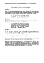 Drucksache 14/234 (14/220) Landtag des Saarlandes - 14. Wahlperiode - In welchem Abstand werden die Betriebe kontrolliert? Zu Frage 3: Etwa 50% der Gastronomiebetriebe werden jährlich kontrolliert, der Rest in größeren, höchstens jedoch 3-jährigen Abständen. Einige Betriebe werden abhängig von ihrer Risiko- einstufung auch in kürzeren Abständen, von einem Tag bis sechs Monaten, kontrolliert. Wie viele gastronomische Betriebe gibt es aktuell im Saarland? Wie viele davon werden jährlich kontrolliert und wie viele in größeren Abständen? Zu Frage 4: Aktuell sind im Saarland 4.755 Gastronomiebetriebe registriert. Wegen der Angaben zu Kontrollfrequenzen wird auf die Antwort zu Frage 3 verwiesen. Gab es 2009 Betriebsschließungen wegen Hygie- nemängel? In wie vielen Fällen wurden Betriebe vorübergehend oder ganz geschlossen? Gab es Betriebe die mehr als einmal geschlossen wurden? Wenn ja, wie viele und wie oft? Zu Frage 5: Im Jahr 2009 waren 10 Betriebe wegen Hygienemängeln vorübergehend geschlossen worden. Endgültige Betriebsschließungen mussten ebenso wenig angeordnet werden wie mehrfache Schließungen eines einzelnen Betriebes. Wie viele Bußgelder in welcher Höhe sind 2009 von den Lebensmittelkontrolleuren eingezogen worden? Den Lebensmittelkontrolleuren vor Ort steht im Rahmen ihrer Tätigkeit nur die Verwar- nungsbefugnis nach § 56 des Gesetzes über Ordnungswidrigkeiten (OWiG) zu. Bußgeldbescheide werden gemäß § 2 Absatz 5 des Gesetzes über das öffentliche Vete- rinärwesen und die amtliche Lebensmittelüberwachung (VetALG) i.V.m. §§ 65 ff OWiG vom Landesamt für Soziales, Gesundheit und Verbraucherschutz verhängt und vollstreckt. Ins- gesamt wurden auf diese Weise in 2009 Bußgelder in Höhe von 29.210 EUR in der Gast- ronomie verhängt, die Einzelbeträge lagen zwischen 50,- und 2.000,- EUR. -2-