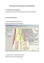 Probennahme für Wasserproben aus Grubenwasser A. Fischbach Gruben Camphausen Keine Probenahme aus dem Grubenwasser wegen schwieriger Zugänglichkeit B. Ensdorf Grube Duhamel 1. Ablauf Flotationsbergeweiher (bis 2011) (Betrieb der Kohlewäsche mit Grubenwasser) 2. Bergwerk Ensdorf im Grubenwasser ab 2013 Gleiche Stelle wie bei den Schwebstoffproben 4