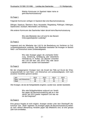 Drucksache 15/1560 (15/1496) Landtag des Saarlandes - 15. Wahlperiode - Welche Kommunen im Saarland haben keine ei- gene Baumschutzsatzung? Zu Frage 1: Folgende Kommunen verfügen im Saarland über eine Baumschutzsatzung: Dillingen, Saarlouis, Überherrn, Bous, Heusweiler, Riegelsberg, Püttlingen, Völklingen, Saarbrücken, Sulzbach, Merchweiler und Homburg. Alle anderen Kommunen des Saarlandes haben derzeit keine Baumschutzsatzung. Wie viele Mitarbeiter des LUA sind für den Bereich Ordnungswidrigkeiten zuständig? Zu Frage 2: Insgesamt sind vier Mitarbeiter des LUA für die Bearbeitung von Verfahren im Ord- nungswidrigkeitsrecht zuständig. Zwei Mitarbeiter bearbeiten die Anzeigen im Bereich Natur- und Artenschutz sowie Landeswaldgesetz. Wie viele Anzeigen gegen die unerlaubte Entfer- nung, Zerstörung, Schädigung oder wesentliche Veränderung im Aufbau von Bäumen erreichten das LUA seit dem Jahr 2012? Wie viele davon werden bzw. wurden nicht bearbeitet? Zu Frage 3: Bei den eingegangenen Anzeigen kann die Anzahl der Fälle auf Grund der Erfas- sungssystematik nur nach Natur- und Artenschutz und Landeswaldgesetz, nicht nach einzelnen Verstößen getrennt werden. Jahr 2012 2013 2014 2015 Natur- und Artenschutz 45 23 37 24 Wald 89 49 40 20 Alle Anzeigen, die bei der Bußgeldstelle eingehen, wurden bzw. werden bearbeitet. Wie viele Bußgeldverfahren aufgrund von Verstö- ßen gegen die Baumschutzsatzung gab es in den Jahren seit 2012 jeweils insgesamt und was wa- ren die Ereignisse? Zu Frage 4: Eine genaue Angabe ist nicht möglich. Anzeigen werden unter dem Oberbegriff „Na- turschutz“ bzw. „Wald“ registriert. Da Anzeigen gegen die Baumschutzsatzung teilwei- se nach näherer Betrachtung Verstöße gegen das BNatSchG sind, ist eine genaue Zahl nicht ermittelbar. -2-