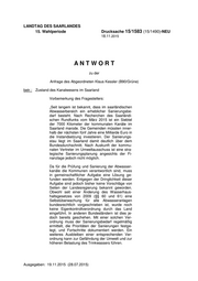 LANDTAG DES SAARLANDES 15. Wahlperiode Drucksache 15/1583 (15/1490)-NEU 18.11.2015 ANTWORT zu der Anfrage des Abgeordneten Klaus Kessler (B90/Grüne) betr.: Zustand des Kanalwesens im Saarland Vorbemerkung des Fragestellers: „Seit langem ist bekannt, dass im saarländischen Abwasserbereich ein erheblicher Sanierungsbe- darf besteht. Nach Recherchen des Saarländi- schen Rundfunks vom März 2015 ist ein Siebtel der 7000 Kilometer der kommunalen Kanäle im Saarland marode. Die Gemeinden müssten inner- halb der nächsten fünf Jahre eine Milliarde Euro in die Instandsetzung investieren. Der Sanierungs- stau liegt im Saarland damit deutlich über dem Bundesdurchschnitt. Nach Auskunft der kommu- nalen Vertreter im Umweltausschuss ist eine stra- tegische Sanierungsplanung angesichts der Fi- nanzlage jedoch nicht möglich. Da für die Prüfung und Sanierung der Abwasser- kanäle die Kommunen verantwortlich sind, muss in gemeinschaftlicher Aufgabe eine Lösung ge- funden werden. Entgegen der Dringlichkeit dieser Aufgabe sind jedoch bisher keine Vorschläge von Seiten der Landesregierung bekannt geworden. Obwohl seit einer Änderung des Wasserhaus- haltsgesetzes von 2009 (§§ 60 und 61) eine Selbstüberwachung für alle Abwasseranlagen bundesrechtlich vorgeschrieben ist, wurde noch keine Eigenkontrollverordnung durch das Land eingeführt. In anderen Bundesländern ist dies je- doch bereits geschehen. Mit einer solchen Ver- ordnung muss der Sanierungsbedarf regelmäßig ermittelt, die Prioritäten der Sanierungen festge- legt, und Fortschritte dokumentiert werden. Ein weiteres Ausbleiben einer entsprechenden Ver- ordnung kann zur Gefährdung der Umwelt und zur höheren Belastung des Trinkwassers führen. Ausgegeben: 19.11.2015 (28.07.2015)