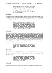 Drucksache 15/1583 (15/1490) Landtag des Saarlandes - 15. Wahlperiode - Welches Ergebnis hat die von Ende März 2015 begonnene Umfrage des saarländischen Städte- und Gemeindetages zum Sanierungsstau der Ka- näle ergeben? Wie viele Kommunen haben sich bis zum Zeitpunkt der Antwort dieser Anfrage zu der Umfrage geäußert? zu Frage 2: Die Umfrage wurde nicht weiter verfolgt, da die Fragestellungen nicht eindeutig waren und deshalb keine vergleichbaren Ergebnisse zu Stande kamen. Zudem wurden nicht alle Fragen beantwortet und eine Beteiligung von 23 Kommunen spiegelt nicht das Bild aller saarländischen Kommunen. Gab es bereits Zwischenfälle aufgrund maroder Kanalsysteme? Wie hoch schätzt die Landes- regierung die finanzielle Mehrbelastung für die Kommunen bis zum Jahr 2020 aufgrund von Zwischenfällen durch marode Abwasserkanäle (z.B. von Verstopfungen, Überschwemmungen oder der Infiltration von Fremdwasser)? zu Frage 3: Es wurden immer wieder Zwischenfälle, mehr oder weniger zufällig, bekannt. Aller- dings gibt es darüber keine landesweiten Erhebungen. Insoweit kann auch nicht beur- teilt werden, ob es mittelfristig zu finanziellen Mehrbelastungen kommt. Tatsache ist, dass in der Vergangenheit erforderliche Investitionen unterblieben - man also „gespart hat“ - zu Lasten der Zukunft. Im Übrigen treffen Mehr- oder Minderbelastungen die Kommunen nur indirekt, da alle Belastungen aus dem Kanalsystem nach dem Kosten- deckungsprinzip über Gebühren durch den „Abwasserbürger“ geschultert werden. Nur insoweit die Kommunen für kommunale Anlagen das Kanalsystem mitnutzen, treffen eventuelle Mehrkosten auch sie. Bis wann sollen die Arbeiten des Landesamts für Umwelt- und Arbeitsschutz (LUA) an einem Entwurf zur Eigenkontrollverordnung beendet sein? Zu Frage 4: Die vorbereitenden fachlichen Arbeiten am Entwurf der Eigenkontrollverordnung sollen bis zum 15. Dezember 2015 vom Landesamt für Umwelt- und Arbeitsschutz abge- schlossen sein. Plant die Landesregierung neben dem Abwasser- kataster ein weiteres Reglement zur Eigen- kontrolle der Kanäle einzuführen, falls sie mittlerweile von der Einführung einer Eigen- kontrollverordnung absieht? zu Frage 5: Die Landesregierung sieht nicht von der Einführung der Eigenkontrollverordnung ab. -3-