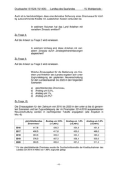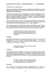 Drucksache 15/1524 (15/1435) Landtag des Saarlandes - 15. Wahlperiode - Vorbemerkung der Landesregierung: Neben den Konsolidierungsmaßnahmen der Landesregierung unterstützen auch güns- tige Rahmenbedingungen wie ein anhaltend niedriges Zinsniveau den Prozess des Defizitabbaus im Landeshaushalt. Entgegen der Vorbemerkung des Fragestellers wird gemäß Haushaltsplan 2015 je- doch nicht mit einem Rückgang der Zinsausgaben um 30 Mio. € gegenüber dem Er- gebnis des Haushaltsvollzugs des Jahres 2014 gerechnet. Aus dem Haushaltsplan ergibt sich vielmehr ein weiterer Defizitabbau um 76 Mio. €, während für die Zinsaus- gaben ein Anstieg von 3 Mio. € erwartet wird. Das strukturelle Defizit des Landes (einschließlich kreditfinanzierter Extrahaushalte) konnte im Ergebnis zwischen 2010 und 2014 um 648 Mio. € abgebaut werden. Im sel- ben Zeitraum sind die Zinsausgaben jedoch nur um 47 Mio. € gesunken. Die Landesregierung baut ihre Planungen außerdem keineswegs auf der Annahme auf, dass das historisch niedrige Zinsniveau weiter anhält. Vielmehr legt die Landesre- gierung ihren Planungen eine allmähliche Normalisierung des Zinsniveaus zugrunde. In welchem Volumen muss das Land in den kom- menden Jahren fällige Kredite und Anleihen refi- nanzieren? (Bitte um jährliche Übersicht bis zum Jahr 2020) Zu Frage 1: Das Refinanzierungsvolumen des Landes beläuft sich zum 01.07.2015 - also ohne die Refinanzierung von in der Zukunft liegenden Kreditaufnahmen - für 2016 auf 1.488 Mio. €, für 2017 auf 1.353 Mio. €, für 2018 auf 1.169 Mio. €, für 2019 auf 1.165 Mio. € und für 2020 auf 1.434 Mio. €. In welchem Volumen hält das Land derzeit Kredite mit variablem Zinssatz? Zu Frage 2: Als Kredite werden hier die beiden vom Land genutzten Schuldinstrumente Anleihen und Schuldscheindarlehen verstanden. Der Bestand an variabel verzinslichen Schuld- instrumenten des Landes beläuft sich zum 01.07.2015 auf 2.320 Mio. €. Der Anteil der Anleihen hieran beläuft sich auf 2.095 Mio. €, der Anteil der Schuldscheindarlehen auf 225 Mio. €. In welchem Umfang sind diese Kredite mit variab- lem Zinssatz gegen eine Zinsniveausteigerung über Zinsbegleitvereinbarungen abgesichert? Zu Frage 3: Zum 01.07.2015 sind variabel verzinsliche Schuldinstrumente in Höhe von 1.301 Mio. € gegen Zinssteigerungen durch Zinsbegleitvereinbarungen abgesichert. -2-