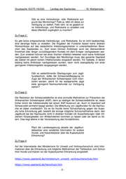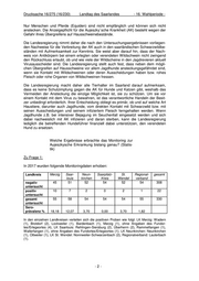 Drucksache 16/275 (16/230) Landtag des Saarlandes - 16. Wahlperiode - Gibt es eine Verbreitungs- oder Risikokarte auf- grund des Monitorings? Falls ja, bitte ich diese zur Verfügung zu stellen. Falls nein, ist es geplant ei- ne Verbreitungs- und Risikokarte zu erstellen und diese öffentlich zugänglich zu machen? Zu Frage 2: Es gibt keine entsprechende Verbreitungs- und Risikokarte. Es ist nicht beabsichtigt, eine derartige Karte zu erstellen. Die Angaben der Fundorte lassen keine direkten Rückschlüsse auf das tatsächliche Infektionsgeschehen in unterschiedlichen Berei- chen des Saarlandes zu. Zum einen können Antikörper auch bei überwundener Krankheit oder länger zurückliegendem Kontakt mit dem Erreger nachgewiesen wer- den. Zum anderen können bei einer frischen Infektion teilweise noch keine Antikörper nachgewiesen werden. Auf Grundlage des Monitorings muss das gesamte Saarland als Gebiet mit gleich hohem Infektionsrisiko eingestuft werden. Für Gebiete, in denen bislang keine Antikörper nachgewiesen wurden, kann nicht zwangsläufig von einer geringeren Infektionsgefahr ausgegangen werden. Gibt es weiterführende Überlegungen zum Jagd- hundeschutz, sollte die Schwarzwildbejagung im Zuge der Afrikanischen Schweinepest noch inten- siviert werden, damit für die waidgerechte Jagd stets genügend Nachsuchehunde zur Verfügung stehen? Zu Frage 3: Die Reduktion der Schwarzwilddichte ist eine sinnvolle Maßnahme zur Prävention der Afrikanischen Schweinepest (ASP), denn je niedriger die Schwarzwilddichte ist, desto früher bricht die Infektionskette bei einem ASP-Ausbruch ab. Auch im Saarland soll Schwarzwild vermehrt bejagt werden. Die Mitwirkung von Jagdhunden für die Nachsu- che ist dabei unerlässlich. Da es für Hunde keine Schutzimpfung gegen die Aujes- zky´sche Erkrankung gibt, besteht die einzige mögliche Schutzmaßnahme darin, den Jagdhund bei der Nachsuche nicht in direkten Kontakt mit Ausscheidungen oder infi- ziertem Körpergewebe von Wildschweinen kommen zu lassen oder sie damit zu füt- tern. Dies liegt alleine in der Verantwortung des Hundeführers. Plant die Landesregierung abseits der Jagdhun- debesitzer eine verstärkte Information für andere Hunde- und Katzenbesitzer über die Aujeszkysche Erkrankung? Zu Frage 4: Auf der Internetseite des Ministeriums für Umwelt und Verbraucherschutz sind Infor- mationen über die Erkrankung und mögliche Maßnahmen der Tierbesitzer zum Schutz ihrer Hunde und Katzen vor der Aujeszkyschen Erkrankung eingestellt: https://www.saarland.de/ministerium_umwelt_verbraucherschutz.htm https://www.saarland.de/tierschutz.htm -3-