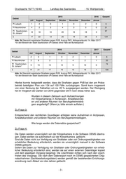 Drucksache 16/77 (16/40) Landtag des Saarlandes - 16. Wahlperiode - Wie hat sich die Zahl tätlicher Angriffe auf Polizei- kräfte im Saarland seit Beginn des Einsatzes von Körperkameras entwickelt? (Bitte einzeln auflisten nach Monat und Zahl.) Zu Frage 2: Im Rahmen eines Sachstandsberichts an das Ministerium für Inneres, Bauen und Sport wurden die Gesamtzahlen der Straftaten zum Nachteil von Polizeivollzugsbeam- tinnen oder Polizeivollzugsbeamten (PVB) in den Zuständigkeitsbereichen der Polizei- 1 inspektionen (PI) erhoben. Die Polizeiliche Kriminalstatistik (PKS) ermöglicht die Aus- wertung ausschließlich über den Begriff der Opferspezifik, in diesem Fall PVB. Die von der Auswertung umfassten Straftaten enthalten deshalb neben den unmittelbaren tätli- chen Angriffen auch andere Straftaten zum Nachteil von Polizeivollzugsbeamtinnen oder Polizeivollzugsbeamten. Referenzzeitraum ist der Zeitraum des Probebetriebs vom 5. Juli 2016 bis 5. Januar 2017. Die entsprechenden Daten aus den Jahren 2014 und 2015 wurden als Vergleichswerte herangezogen und umfassen folgende Delikte der polizeilichen Kriminalstatistik: Exhi- bitionistische Handlungen, Gefährliche Körperverletzung, Körperverletzung, Fahrlässi- ge Körperverletzung, Nötigung, Bedrohung, Widerstand gg. PVB. Eine genauere delik- tische Aufschlüsselung der Fallzahlen erfolgte an dieser Stelle nicht, da in den Ver- gleichszeiträumen unterschiedliche PKS-Erfassungspraktiken herrschten, wodurch nur die Gesamtzahlen gegenübergestellt werden können. Gebiet 2014 2015 2016 PI Lebach 9 6 6 PI Neunkirchen 26 21 20 PI Saarbrücken-St. Johann* 97 97 74 Σ 132 124 100 Abb. 1 Übersicht registrierter Straftaten gegen PVB, Auszug PKS, Abfragezeitpunkt: 14. März 2017/ *für den Bereich der Stadt Saarbrücken (PI-Gebiet) ohne Fälle der Bundespolizei 2014 2015 Gesamt Gebiet Juli August September Oktober November Dezember Januar PI Lebach 2 2 1 0 3 1 0 9 PI Neunkirchen 3 5 5 1 4 8 0 26 PI Saarbrücken- 97 18 17 15 7 21 18 1 St. Johann* Σ 23 24 21 8 28 27 1 132 Abb. 2a Übersicht registrierter Straftaten gegen PVB, Auszug PKS, Abfragezeitpunkt: 14. März 2017/ *für den Bereich der Stadt Saarbrücken (PI-Gebiet) ohne Fälle der Bundespolizei 1 Ohne Straftaten zum Nachteil der Beamten der Bundespolizei -2-