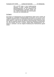 Drucksache 16/77 (16/40) Landtag des Saarlandes - 16. Wahlperiode - CDU und SPD haben in ihrem Koalitionsvertrag vereinbart, zu prüfen, „inwiefern die rechtlichen Rahmenbedingungen für eine Erweiterung des Anwendungsbereiches geschaffen werden kön- nen“. Welche Erweiterungen des Anwendungsbe- reichs plant die Landesregierung? Zu Frage 5: Der Einsatz von Körperkameras bei der Saarländischen Polizei wurde zunächst als Pilotprojekt bei ausgewählten Polizeidienststellen durchgeführt und hat sich im We- sentlichen bewährt, so dass eine landesweite Einführung für alle polizeilichen Dienst- stellen geplant ist. Sollte sich bei der geplanten flächendeckenden Anwendung erge- ben, dass der bisherige rechtliche Rahmen in bestimmten polizeilichen Einsatzsituatio- nen nicht ausreicht, das Ziel zu erreichen, Gewalt gegen Polizeibeamtinnen und - beamte zu verhindern, soll eine mögliche Erweiterung des Rechtsrahmens geprüft werden. -4-