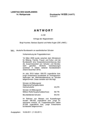 LANDTAG DES SAARLANDES 14. Wahlperiode Drucksache 14/520 (14/477) 16.06.2011 ANTWORT zu der Anfrage der Abgeordneten Birgit Huonker, Barbara Spaniol und Heike Kugler (DIE LINKE.) betr.: deutsche Bundeswehr an saarländischen Schulen Vorbemerkung der Fragestellerinnen: “Im März 2009 wurde zwischen dem Ministerium für Bildung, Familie, Frauen und Kultur und der Bundeswehr eine Kooperationsvereinbarung über die Zusammenarbeit von Schulen und Bundes- wehr getroffen. Ähnliche Vereinbarungen existieren in sieben weiteren Bundesländern (Stand Dezember 2010). Im Jahr 2010 haben 196.075 Jugendliche bzw. junge Erwachsene bundesweit an Vortragsveran- staltungen der Wehrdienstberatung an Schulen teilgenommen. Diese verteilen sich wie folgt: Schulen mit Bildungsziel Allgemeine/Fachgebundene Hochschulreife: 43.279 Schulen mit Bildungsziel Mittlere Reife/Hauptschulabschluss: 58.778 Berufsbildende Schulen: 94.018 Im Rahmen von Messen und Ausstellungen wurden 590.002 Jugendliche bzw. junge Er- wachsene erreicht, an Truppenbesuchen haben 22.206 Jugendliche bzw. junge Erwachsene bundesweit teilgenommen.” Ausgegeben: 16.06.2011 (11.05.2011)