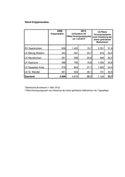 Stand Krippenausbau 2008 2012 U3-Plätze/ Krippenplätze vorhandene U3- Versorgungsquote Plätze/Versorgungsquotez nach Umsetzung der um 1.03.2012* bisher geförderten Maßnahmen² RV Saarbrücken 839 1.422 19,7 2.331 31,9 LK Merzig-Wadern 343 561 24,7 816 35,4 LK Neunkirchen 351 566 20,8 946 35,2 LK Saarlouis 486 795 18,8 1.302 30,8 LK Saarpfalz-Kreis 579 804 27,1 1.003 34,4 LK St. Wendel 301 522 30,1 731 42,5 Saarland 2.899 4.670 22,1 7.129 33,7 *Statistisches Bundesamt (1. März 2012) ² Plätze/Versorgungsquote nach Abschluss der bisher geförderten Maßnahmen inkl. Tagespflege