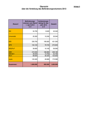 Übersicht Anlage 5 über die Verteilung des Beförderungsvolumens 2013 Beförderungs- Aufstockungs- volumen zum Stand betrag für das Ressort Gesamt 1. April 2013 Jahr 2013 in € in € StK 34.700 8.640 43.340 Universität 25.300 10.240 35.540 MIS 235.700 195.600 431.300 MFE 194.100 78.720 272.820 MSGFuF 39.900 16.160 56.060 MBK 219.300 188.880 408.180 MWAEV 39.000 15.760 54.760 MUV 89.600 36.320 125.920 Justiz 122.400 49.680 172.080 Zusammen: 1.000.000 600.000 1.600.000