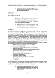 Drucksache 15/571 (15/520) Landtag des Saarlandes - 15. Wahlperiode - b) Wie beurteilt die Landesregierung die Durch- setzbarkeit dieser Optionen auf den verschie- denen politischen Ebenen? Zu Frage 2b: Siehe Antwort zu Frage 2a. Welche generellen gesetzlichen und untergesetz- lichen Optionen sieht die Landesregierung zur Er- höhung der Landeseinnahmen des Saarlandes (bitte nach Einnahmeart gliedern) a) Wie bewertet die Landesregierung diese nach den Gesichtspunkten gesellschaftliche, wirt- schaftliche sowie politische Konsequenzen? Zu Frage 3a: Die Regierungschefinnen und Regierungschefs der Länder haben im Rahmen ihrer Jahrestagung vom 24. - 26. Oktober 2012 einen Beschluss zur „Neugestaltung der Bund-Länder-Finanzbeziehungen“ gefasst. Entsprechend diesem Beschluss hat die Finanzministerkonferenz der Konferenz der Ministerpräsidentinnen und Ministerpräsi- denten im Juni 2013 „in einem ersten Schritt […] eine Bestandsaufnahme zu den Aus- gangs- und Problemlagen“ vorgelegt und wird im Dezember 2013 in einem zweiten Schritt hierzu ein „Meinungsbild“ vorlegen. Bis zum Sommer 2015 sollen Eckpunkte für die Finanzreform 2020 festgelegt werden; die Ergebnisse der Verhandlungen zwischen Bund und Ländern sollen bis 2016 gesetzgeberisch umgesetzt sein. Im Beschluss der Regierungschefinnen und Regierungschefs von Oktober 2012 wer- den folgende zu bearbeitende finanzbezogene Themen genannt: - Aufgabenverteilung zwischen Bund und Ländern, - Lastenverteilungsgrundsätze, - Altschulden, Finanzierungsmodalitäten und Zinslasten, - Mischfinanzierungen, - Steuergesetzgebungskompetenz und Steuerertragshoheit, - Steuerertragsverteilung unter den Ländern, - Gemeindesteuersystem, - Grundsatzfragen des Finanzausgleichs, - vertikaler Finanzausgleich, - horizontaler Finanzausgleich, - Verteilungswirkungen sonstiger Bundesmittel, - Demografie, - Infrastruktur. Die Landesregierung sieht in der auf Ebene der Ministerpräsidenten geführten Diskus- sion um eine Neuordnung der Bund-Länder-Finanzbeziehungen sowohl Risiken, aber auch Chancen zur Stärkung der Einnahmeseite des Landes. b) Wie beurteilt die Landeregierung die Durch- setzbarkeit dieser Optionen auf den verschie- denen politischen Ebenen? Und wo wird sie sich einsetzen? -3-