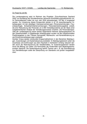 Drucksache 15/571 (15/520) Landtag des Saarlandes - 15. Wahlperiode - Zu Frage 5a und 5b: Die Landesregierung setzt im Rahmen des Projektes „Zukunftssicheres Saarland 2020“ zur Einhaltung der Schuldenbremse zahlreiche Konsolidierungsmaßnahmen um. Im Personalbereich sollen bis zum Jahr 2020 jahresbezogen 120 Mio. € eingespart werden. Zur Umsetzung dieses Einsparziels werden in rd. 30 ressortbezogenen Ar- beitsgruppen mit den jeweiligen Interessenvertretungen (Personalvertretungen, Frau- enbeauftragte, Schwerbehindertenvertretungen) Personalentwicklungspläne erstellt, die eine Reduzierung des Personals um 2.400 Vollzeitäquivalente auf der Basis einer aufgabenkritischen Analyse der Verwaltungsprozesse vorsehen. Die Personaleinspar- ziele der Landesregierung waren bereits Gegenstand mehrerer Spitzengespräche mit den Gewerkschaften. In begleitenden Arbeitsgruppen wurden mit den Gewerkschaften Positionspapiere zu den Themen Demografie, Nachwuchs- und Karriereförderung so- wie Einnahmenverbesserungen erarbeitet. Darüber hinaus werden strukturelle Einsparmaßnahmen in den Bereichen Beteiligun- gen, Zuwendungen und Systemsteuerung erarbeitet. Im Beteiligungsbereich sollen die Zuschüsse und Zuführungen aus dem Haushalt in merklichem Umfang reduziert wer- den durch die Restrukturierung der Gesellschaften. Im Zuwendungsbereich werden durch die Bildung von Zielen und Kennzahlen die Fördermittel nach Bedarfsgesichts- punkten überprüft. Die Systemsteuerung betrifft Themen wie z. B. die Zentralisierung von Dienstleistungen sowie die Überprüfung von Standards und großen Ausgabeblö- cken. -5-